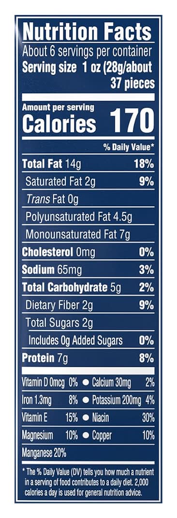 7 g protein per serving (8% DV). Per 1 Oz Serving: 170 calories; 2 g sat fat (9% DV); 65 mg sodium (3% DV); 2 g total sugars. See nutrition information for fat content. Nuts with flavor - Mr. Peanut. Nuts of distinction since 1906. planters.com. Visit us at: planters.com; 1-877-677-3268. Please have package available. • Number of servings: 6 • Hormel Foods Sales, LLC, Austin, MN, 55912, Ph: 877-677-3268