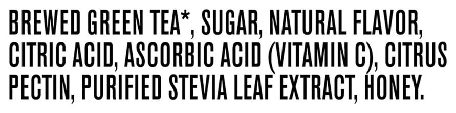 Ingredients: Brewed Green Tea (Rainforest Alliance Certified. Find out more at ra.org), Sugar, Natural Flavor, Citric Acid, Ascorbic Acid (Vitamin C), Citrus Pectin, Purified Stevia Leaf Extract, Honey Contains 47mg of caffeine