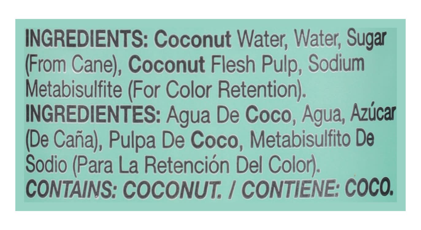 Ingredients: Coconut Water, Water, Sugar (from Cane), Coconut Flesh Pulp, Sodium Metabisulfite (for Color Retention) Contains: Tree Nuts, Coconuts, Sulfites