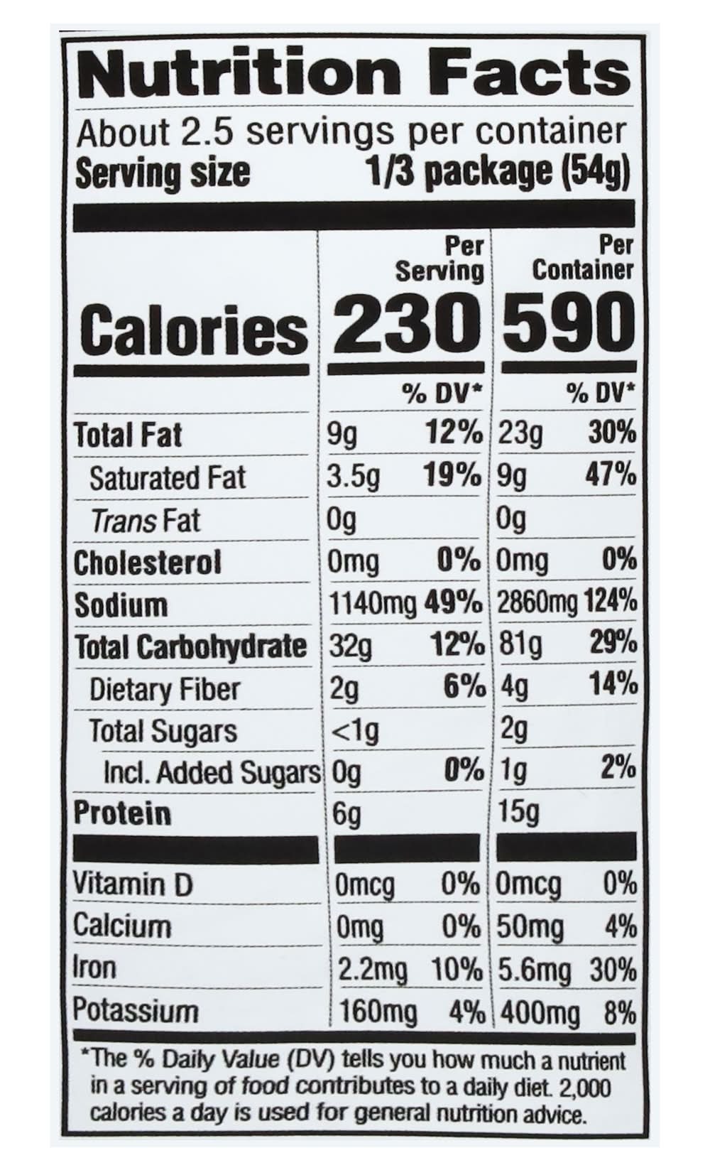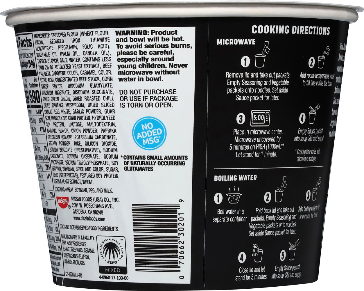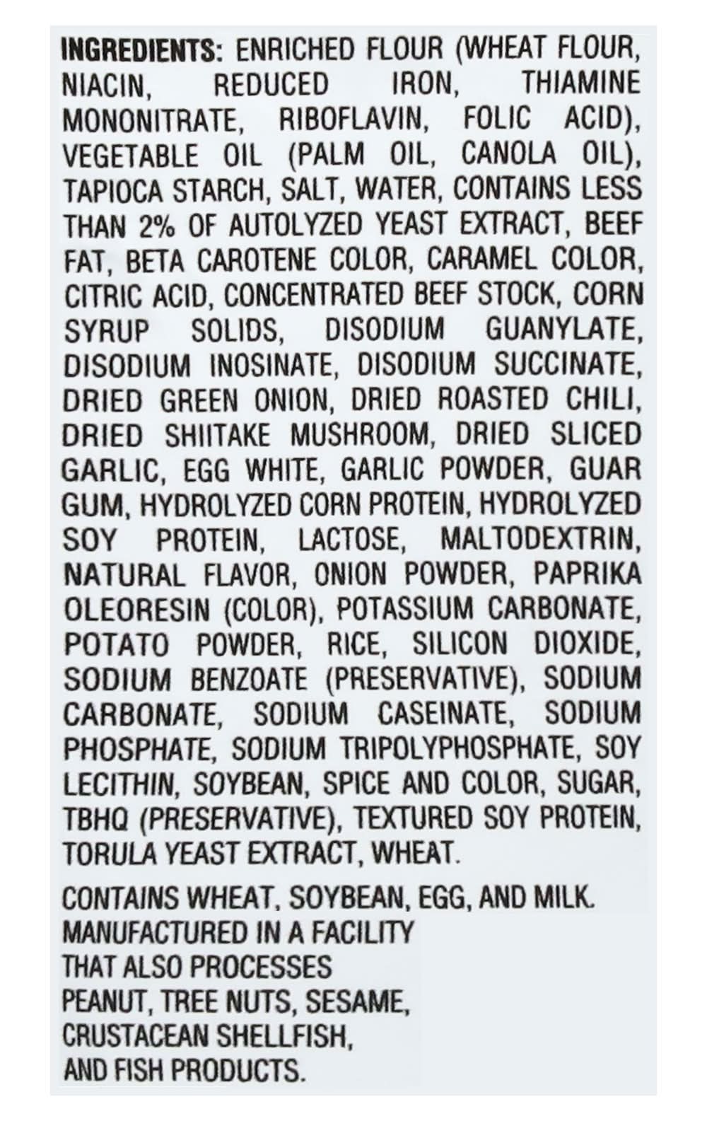 Ingredients: Enriched Flour (Wheat Flour, Niacin, Reduced Iron, Thiamine Mononitrate, Riboflavin, Folic Acid), Vegetable Oil (Palm Oil, Canola Oil), Tapioca Starch, Salt, Water, Contains Less than 2% of Autolyzed Yeast Extract, Beef Fat, Beta Carotene Color, Caramel Color, Citric Acid, Concentrated Beef Stock, Corn Syrup Solids, Disodium Guanylate, Disodium Inosinate, Disodium Succinate, Dried Green Onion, Dried Roasted Chili, Dried Shiitake Mushroom, Dried Sliced Garlic, Egg White, Garlic Powder, Guar Gum, Hydrolyzed Corn Protein, Hydrolyzed Soy Protein, Lactose, Maltodextrin, Natural Flavor, Onion Powder, Paprika Oleoresin (Color), Potassium Carbonate, Potato Powder, Rice, Silicon Dioxide, Sodium Benzoate (Preservative), Sodium Carbonate, Sodium Caseinate, Sodium Phosphate, Sodium Tripolyphosphate, Soy Lecithin, Soybean, Spice and Color, Sugar, TBHQ (Preservative), Textured Soy Protein, Torula Yeast Extract, Wheat Contains: Wheat, Soybeans, Eggs, Milk, Lactose, Peanuts, Tree Nuts, Sesame, Crustacean Shellfish, Fish Additives: Genetically Modified Ingredients