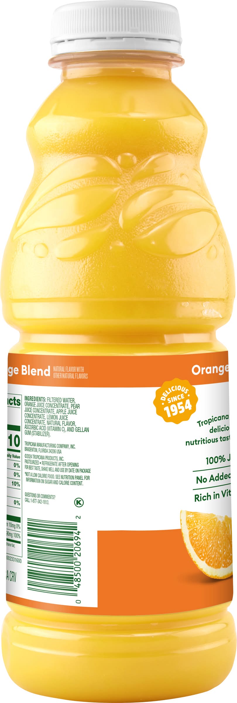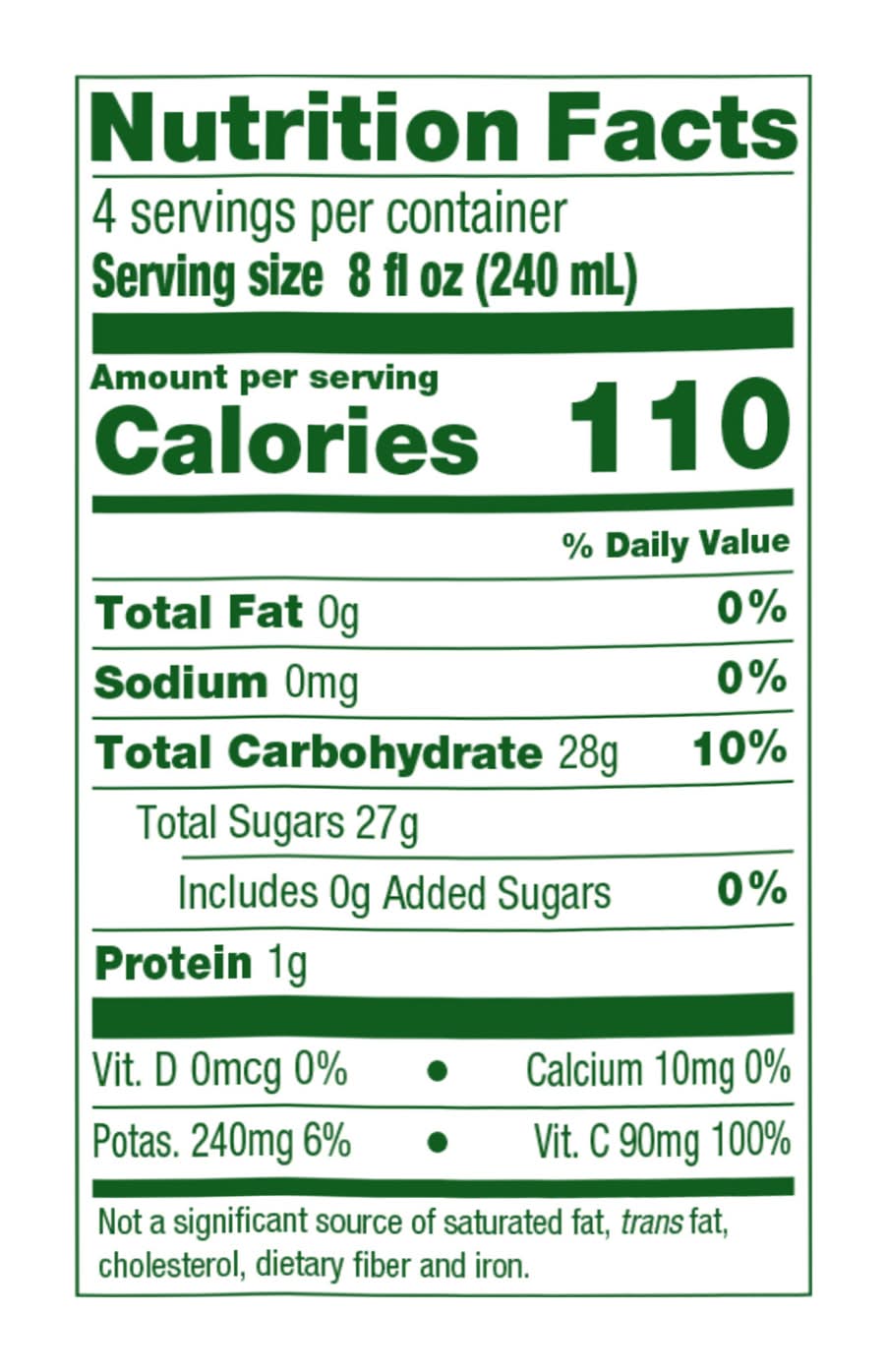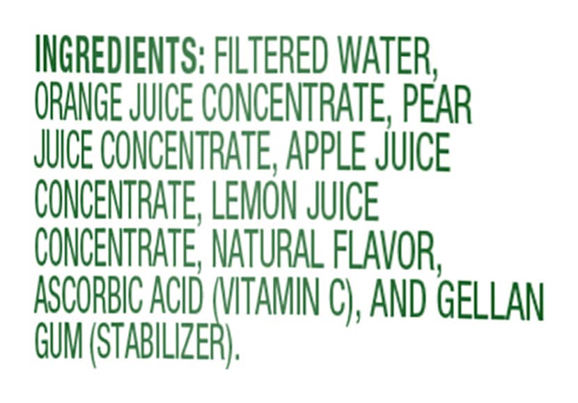 Ingredients: Filtered Water, Orange Juice Concentrate, Pear Juice Concentrate, Apple Concentrate, Lemon Juice Concentrate, Natural Flavor, Ascorbic Acid (Vitamin C), and Gellan Gum (Stabilizer)