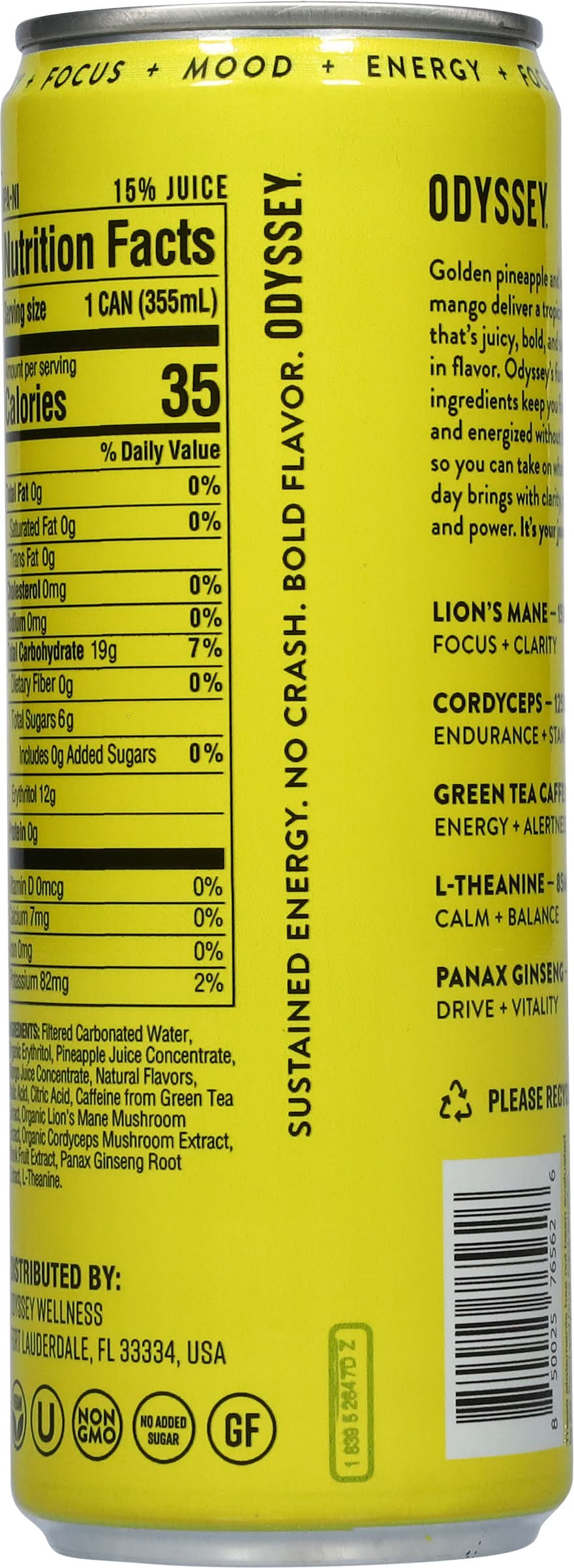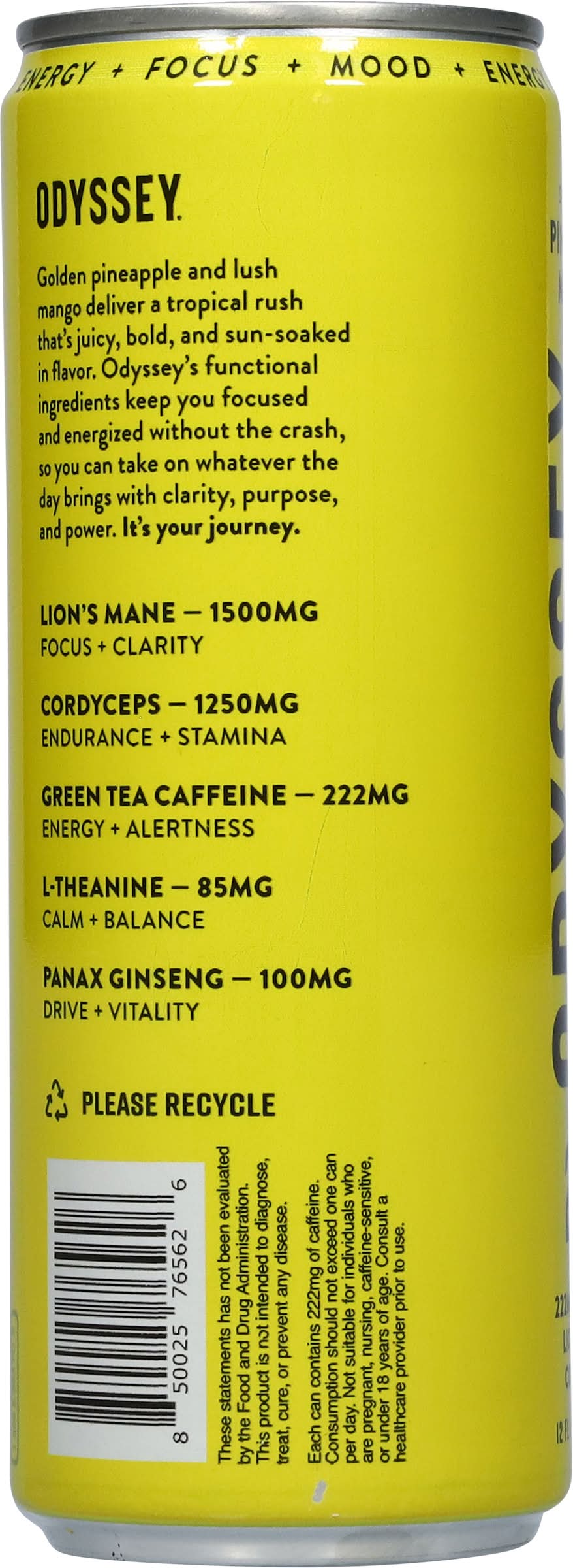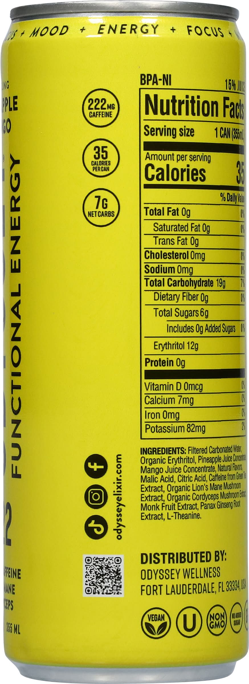 Ingredients: Filtered Carbonated Water, Organic Erythritol, Pineapple Juice Concentrate, Mango Juice Concentrate, Natural Flavors, Malic Acid, Citric Acid, Caffeine from Green Tea Extract, Organic Lion's Mane Mushroom Extract, Organic Cordyceps Mushroom Extract, Monk Fruit Extract, Panax Ginseng Root Extract, L-Theanine