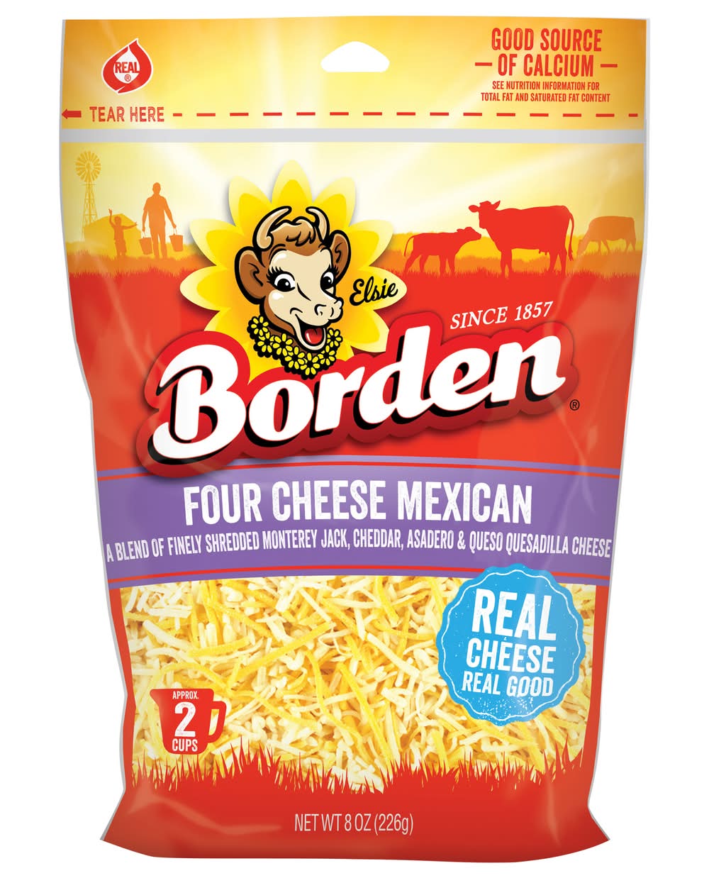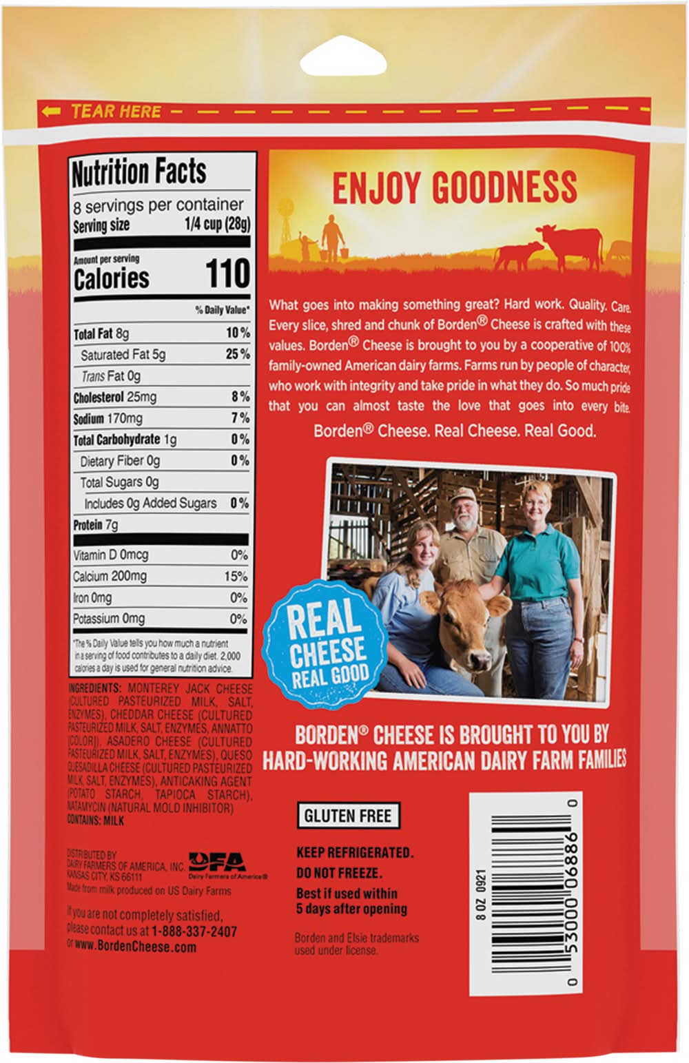 Ingredients: Monterey Jack Cheese (Cultured Pasteurized Milk, Salt, Enzymes), Cheddar Cheese (Cultured Pasteurized Milk, Salt, Enzymes, Annatto [Color]), Asadero Cheese (Cultured Pasteurized Milk, Salt, Enzymes), Queso Quesadilla Cheese (Cultured Pasteurized Milk, Salt, Enzymes), Anticaking Agent (Potato Starch, Tapioca Starch), Natamycin (Natural Mold Inhibitor) Contains: Milk