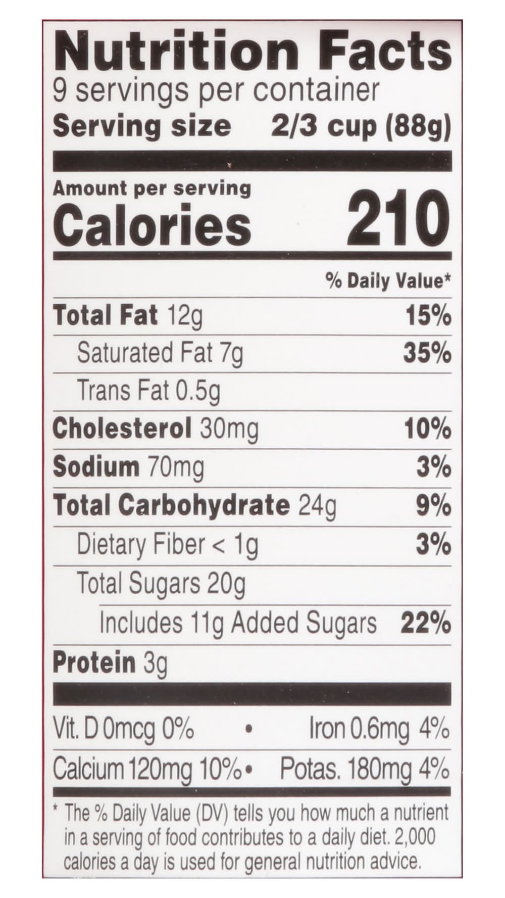 Ingredients: Cream, Skim Milk, Water, Sugar, Corn Syrup, Malt Crunch (Sugar, Crisp Rice, Vegetable Shortening, Vegetable Gum, Corn Sweetener, Invert Sugar, Dry Malt, Liquid Malt), Chocolate [Chocolate Liquor, Sugar, Vegetable Oil (Coconut and Soybean), Cocoa Powder (Processed with Alkali), Soy Lecithin, Vanilla], Whey, Cocoa Powder (Processed with Alkali), Mono- and Diglycerides, Cellulose Gum, Guar Gum, Natural and Artificial Flavor