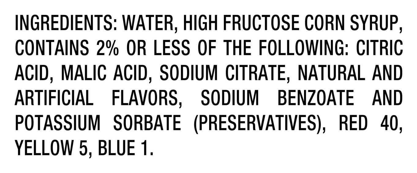 Ingredients: Water, High Fructose Corn Syrup, Contains Less Than 2% of the following: Citric Acid, Malic Acid, Sodium Citrate, Natural and Artificial Flavors, Sodium Benzoate and Potassium Sorbate (Preservatives), Caramel Color, Red 40, Yellow 5, Blue 1 Contains: Does Not Contain Declaration Obligatory Allergens