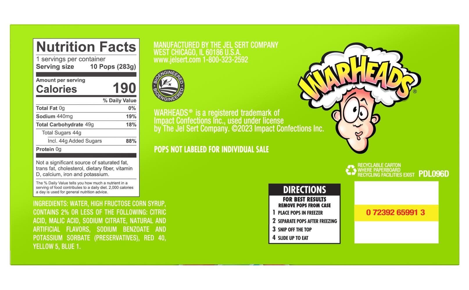 Directions: for best results remove bars from carton. 1. place pops in freezer. 2. separate pops after freezing. 3. snip off the top. 4. slide up to eat.