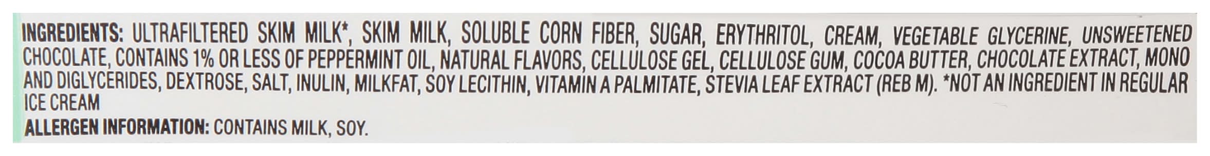 Ingredients: Ultrafiltered Skim Milk*, Skim Milk, Soluble Corn Fiber, Sugar, Erythritol, Cream, Vegetable Glycerine, Unsweetened Chocolate, Contains 1% or less of Peppermint Oil, Natural Flavors, Cellulose Gel, Cellulose Gum, Cocoa Butter, Chocolate Extract, Mono and Diglycerides, Dextrose, Salt, Inulin, Milkfat, Soy Lecithin, Vitamin A Palmitate, Stevia Leaf Extract (Reb M). *Not an ingredient in regular ice cream Contains: Contains Milk, Soy.