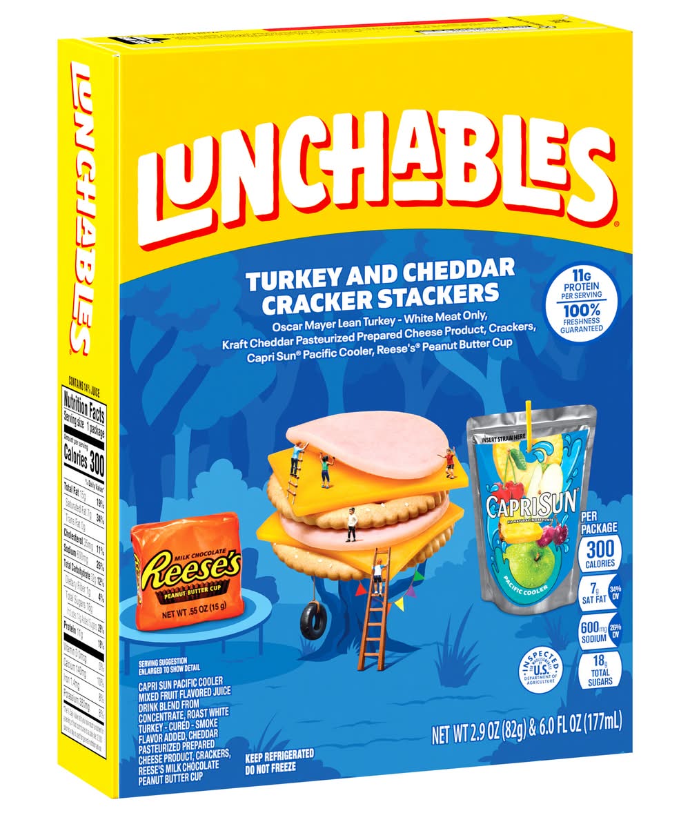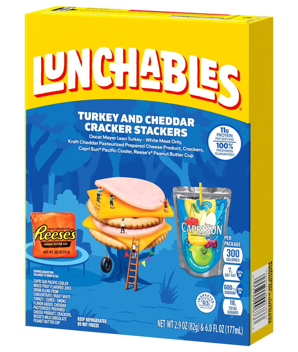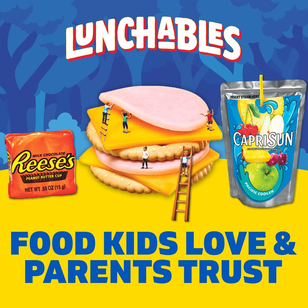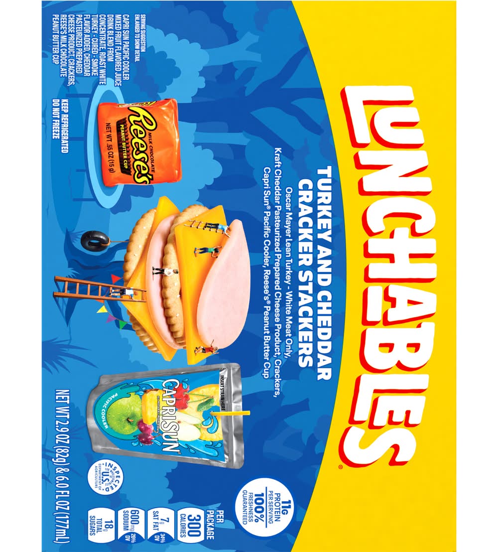Powering kids forward, our Lunchables Turkey and Cheddar Cheese is the perfect option for a convenient meal kids will enjoy any time of day. Our lunch kit features real, epic food including Oscar Mayer white meat lean turkey, Kraft cheddar pasteurized prepared cheese product, crackers, a juicy Capri Sun Pacific Cooler drink and a delectable Reese’s Peanut Butter Cup for a dessert treat. Great for on the go, each ingredient comes in its own individual compartment in our serving tray, making it easy and fun to build your own unique combinations. • Kraft foods, Chicago, IL, 60601 • Packaging: Reusable