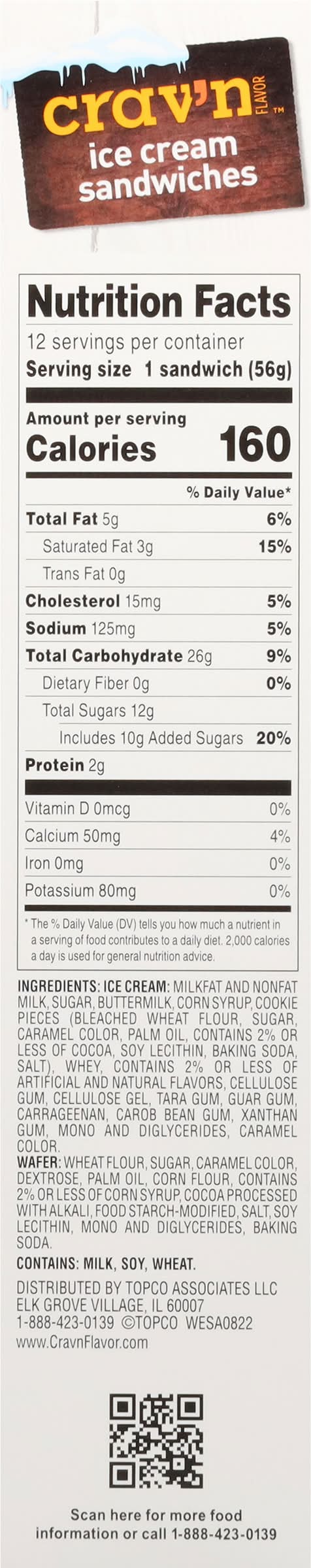 Ingredients: Ice Cream: Milkfat and Nonfat Milk, Sugar, Buttermilk, Corn Syrup, Cookie Pieces (Bleached Wheat Flour, Sugar, Caramel Color, Palm Oil, Contains 2% or Less of Cocoa, Soy Lecithin, Baking Soda, Salt), Whey, Contains 2% or Less of Artificial and Natural Flavors, Cellulose Gum, Cellulose Gel, Tara Gum, Guar Gum, Carrageenan, Carob Bean Gum, Xanthan Gum, Mono and Diglycerides, Caramel Color. Wafer: Wheat Flour, Sugar, Caramel Color, Dextrose, Palm Oil, Corn Flour, Contains 2% or Less of Corn Syrup, Cocoa Processed with Alkali, Food Starch-Modified, Salt, Soy Lecithin, Mono and Diglycerides, Baking Soda Contains: Milk, Soybeans, Wheat, Corn