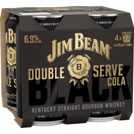 Jim Beam Black is, and always will be, extra-aged for taste and bottled only when it's just right. The result is a full bodied bourbon with an extra level of elegance and refinement that's meant to be sipped and savoured. Canned in Australia and paired with cola to provide a flavourful and refreshing taste all in the convenience of a pre-mixed can. • Pack size: 4 • Alcohol by volume: 6.9%