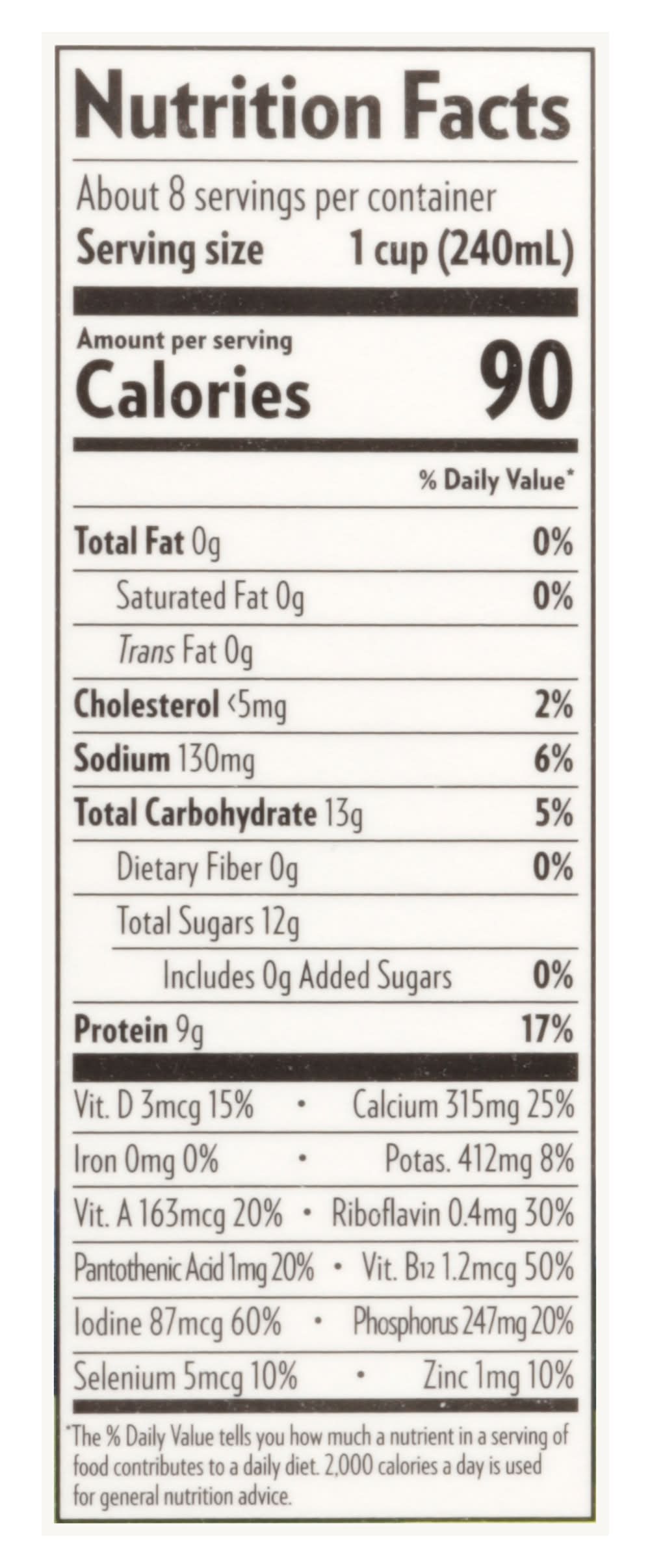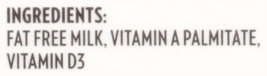 Ingredients: Fat Free Milk, Vitamin A Palmitate, Vitamin D3 Contains: Milk