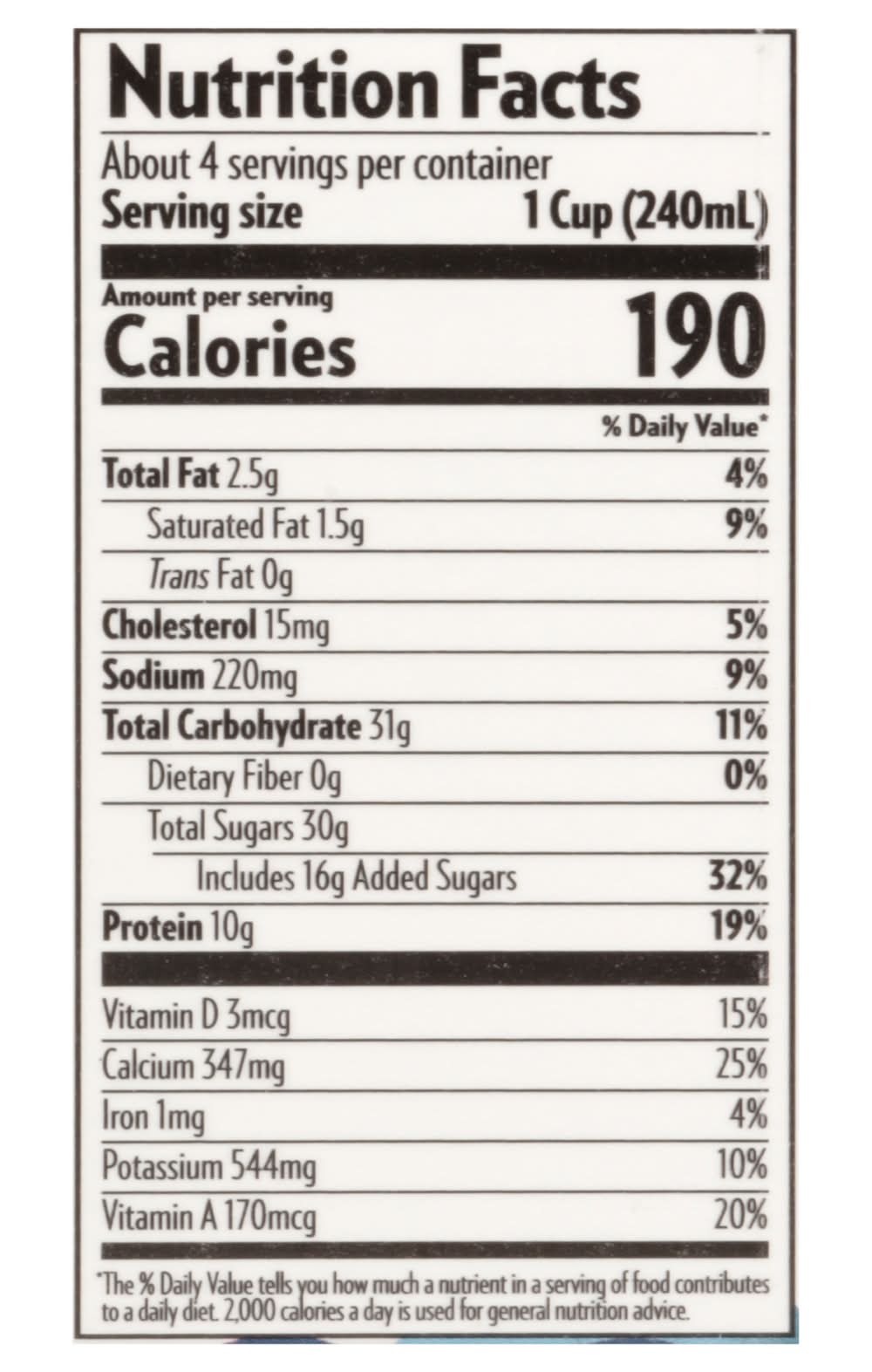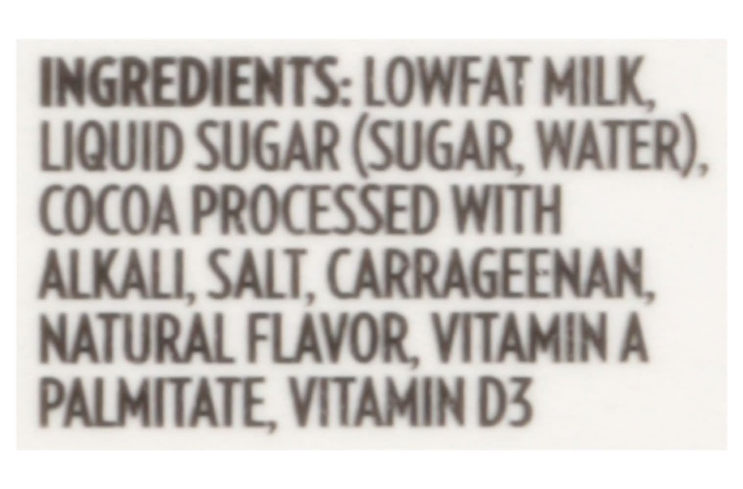 Ingredients: Lowfat Milk, Liquid Sugar (Sugar, Water), Cocoa Processed with Alkali, Salt, Carrageenan, Natural Flavor, Vitamin A Palmitate, Vitamin D3 Contains: Milk