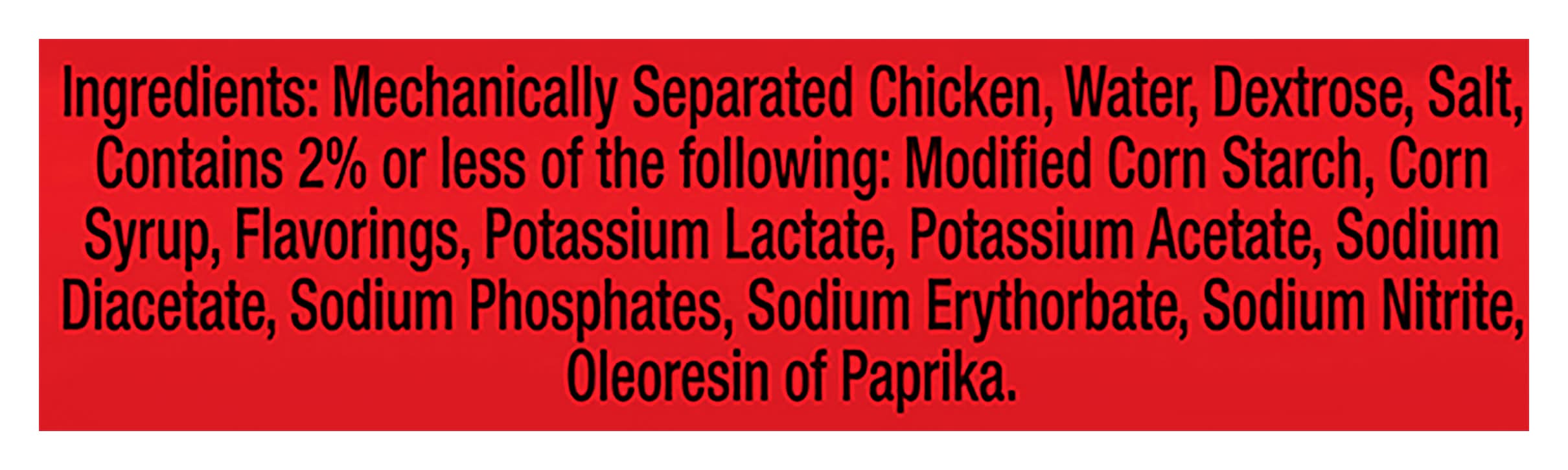Ingredients: Mechanically Separated Chicken, Water, Dextrose, Salt, Contains 2% or Less of the Following: Modified Corn Starch, Corn Syrup, Flavorings, Potassium Lactate, Potassium Acetate, Sodium Diacetate, Sodium Phosphates, Sodium Erythorbate, Sodium Nitrite, Oleoresin of Paprika