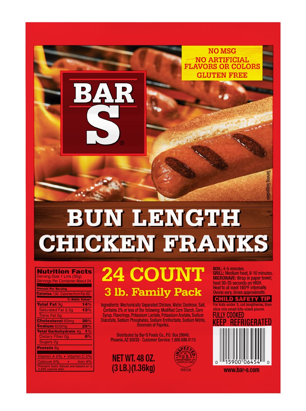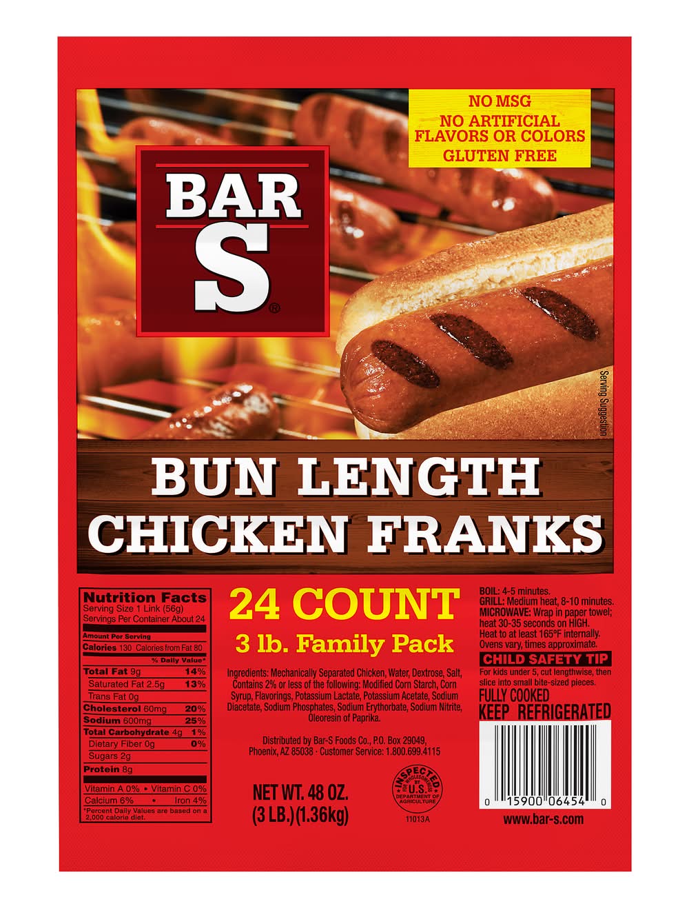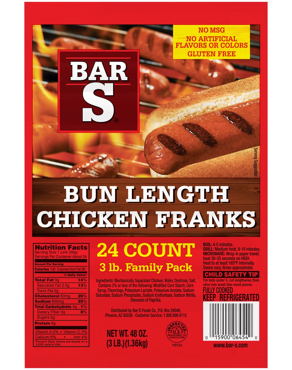 Bun Length Chicken Franks • Size: 8 units • Number of servings: 24 • Bar-S Foods Co., Phoenix, AZ, 85038, Ph: 800-699-4115