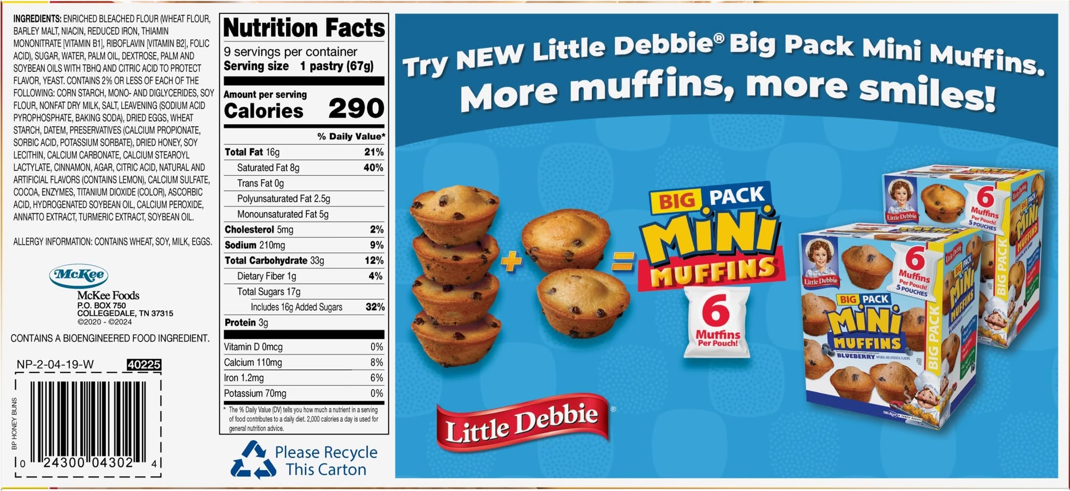 Contains a bioengineered food Ingredient. • Size: 9/2.3 OZ • McKee Foods, PO Box 75,Collegedale,TN,37315 • Packaging: Reusable