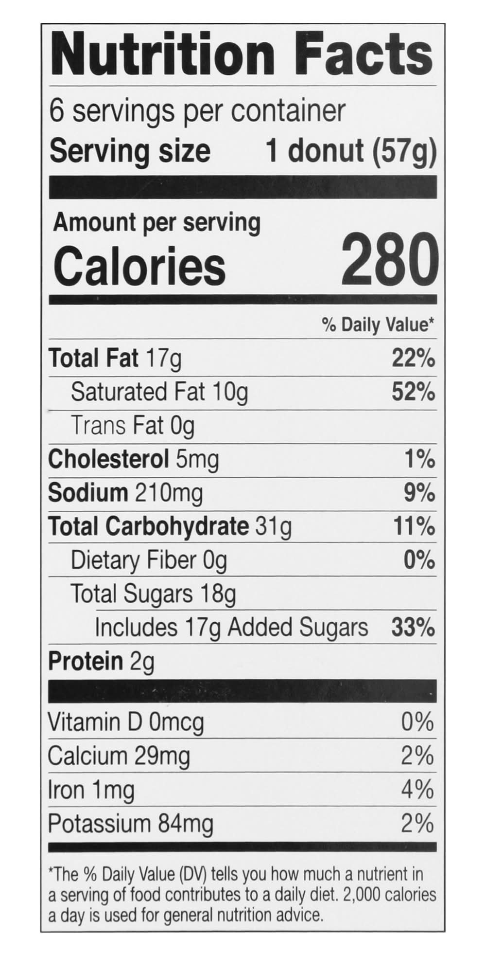 Ingredients: Donut: Donut Mix (Enriched Bleached Wheat Flour [Wheat Flour, Niacin, Iron, Thiamin Mononitrate, Riboflavin, Folic Acid], Sugar, Soybean Oil, Dextrose, Dried Whey [Milk], Leavening [Sodium Acid Pyrophosphate, Sodium Bicarbonate and Monocalcium Phosphate], Soy Flour, Salt, Enzymes [Wheat Flour, Enzymes and Canola Oil], Potato Flour, Dried Egg Yolk, Palm Emulsifier [Mono- and Diglycerides and Citric Acid], Soy Lecithin, Spices, Natural Flavors, Vanillin, Beta Carotene [Color], and Dough Stabilizer [Tapioca-Corn Dextrin, Guar Gum, Wheat Starch, and Karaya Gum]), Water, Sugar, Palm Oil, Donut Coating: Sugar, Palm Kernel Oil Alkalized Cocoa Powder, Soy Lecithin, Vanillin Contains: Wheat, Eggs, Soybeans, Milk
