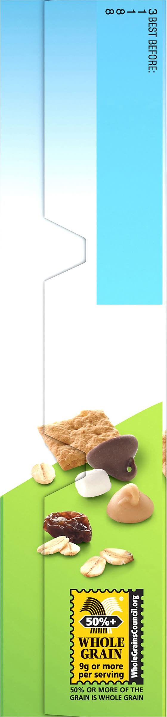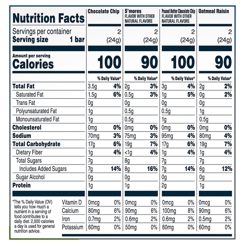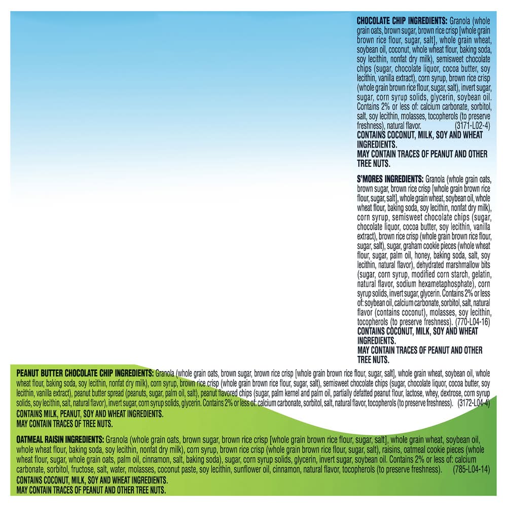 Ingredients: Chocolate Chip Ingredients: Granola Whole Grain Oats, Coconut, Tocopherols to Preserve Freshness, Natural Flavor. S'Mores Ingredients: Granola Whole Grain Oats, Graham Cookie Pieces Whole Wheat Flour, Honey, Dehydrated Marshmallow Bits Sugar, Modified Corn Starch, Gelatin, Sodium Hexametaphosphate, Contains 2% or Less of Soybean Oil, Calcium Carbonate, Natural Flavor Contains Coconut, Tocopherols to Preserve Freshness. Peanut Butter Chocolate Chip Ingredients: Granola Whole Grain Oats, Peanut Butter Spread Peanuts, Peanut Flavored Chips Sugar, Palm Kernel and Palm Oil, Partially Defatted Peanut Flour, Lactose, Whey, Dextrose, Tocopherols to Preserve Freshness. Oatmeal Raisin Ingredients: Granola Whole Grain Oats, Raisins, Oatmeal Cookie Pieces Whole Wheat Flour, Fructose, Water, Coconut Paste, Sunflower Oil, Tocopherols to Preserve Freshness., Soy Lecithin, Brown Sugar, Brown Rice Crisp [Whole Grain Brown Rice Flour, Sugar, Whole Wheat Flour, Salt, Semisweet Chocolate Chips Sugar, Corn Syrup Solids, Cocoa Butter, Invert Sugar, Chocolate Liquor, Baking Soda, Molasses, Soybean Oil, Glycerin, Corn Syrup, Natural Flavor, Sorbitol, Nonfat Dry Milk, Whole Grain Wheat, Cinnamon, Brown Rice Crisp Whole Grain Brown Rice Flour, Contains 2% or Less of: Calcium Carbonate, Palm Oil, Vanilla Extract Contains: Tree Nuts, milk, Soybeans, wheat, Peanuts, Lactose