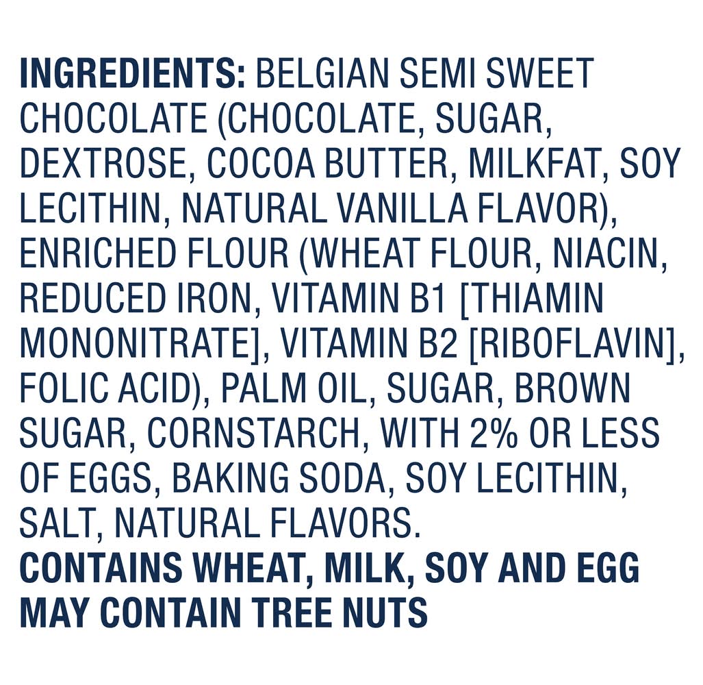 Ingredients: Belgian Semi Sweet Chocolate (Chocolate, Sugar, Dextrose, Cocoa Butter, Milkfat, Soy Lecithin, Natural Vanilla Flavor), Enriched Flour (Wheat Flour, Niacin, Reduced Iron, Vitamin B1 [Thiamin Mononitrate], Vitamin B2 [Riboflavin], Folic Acid), Palm Oil, Sugar, Brown Sugar, Cornstarch, with 2% or Less of Eggs, Baking Soda, Soy Lecithin, Salt, Natural Flavors Contains: Milk, Soybeans, Wheat, Corn, Eggs, Tree Nuts