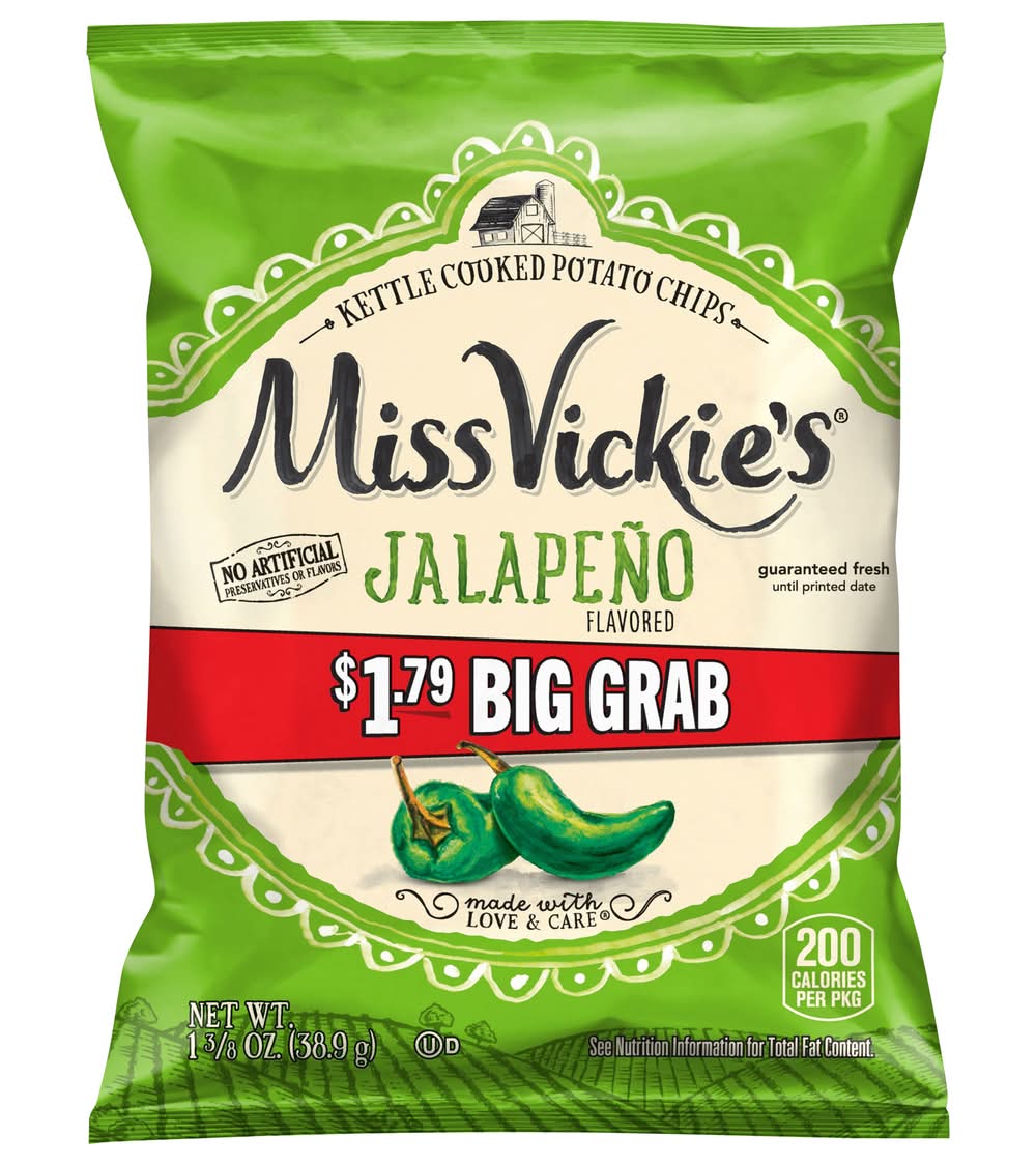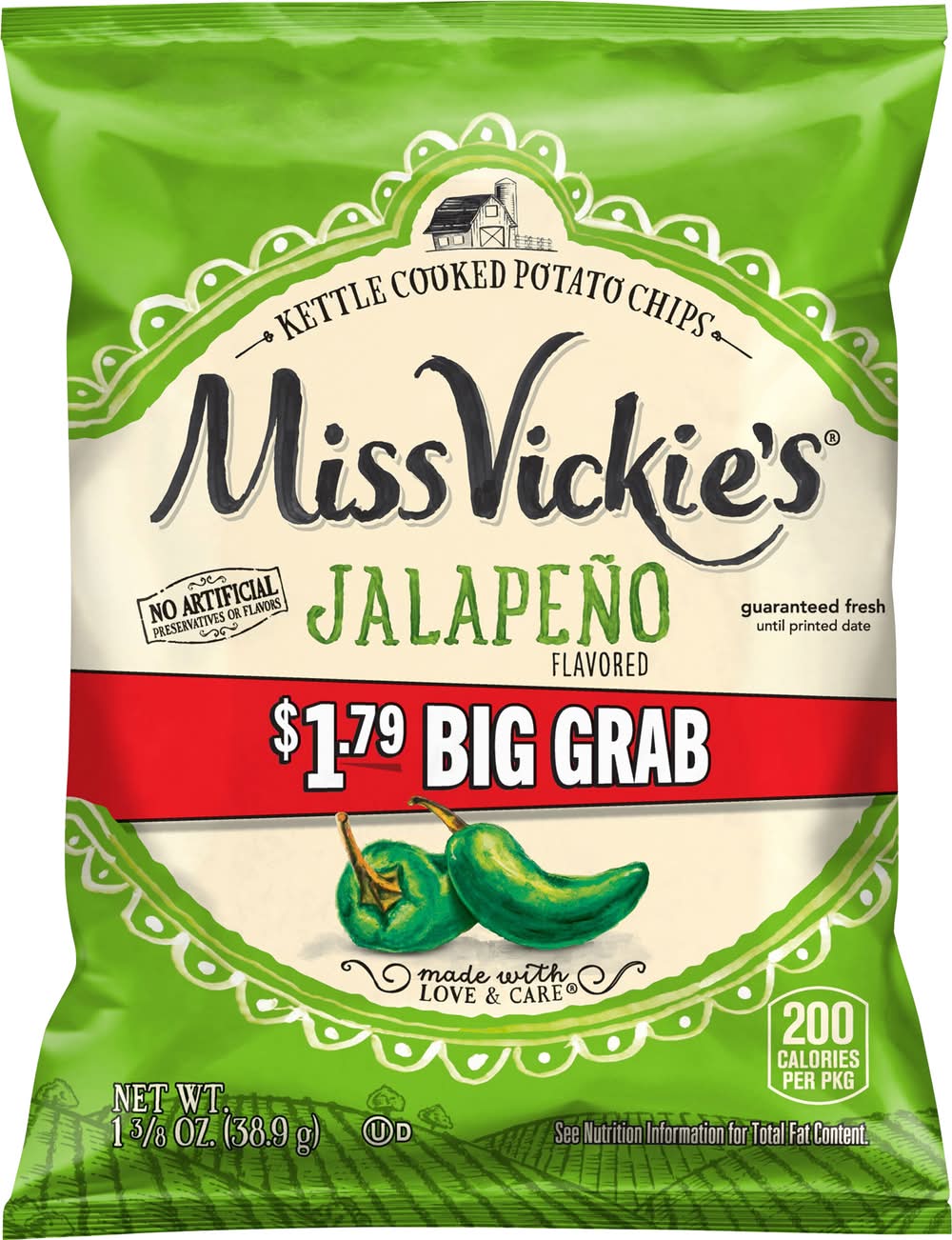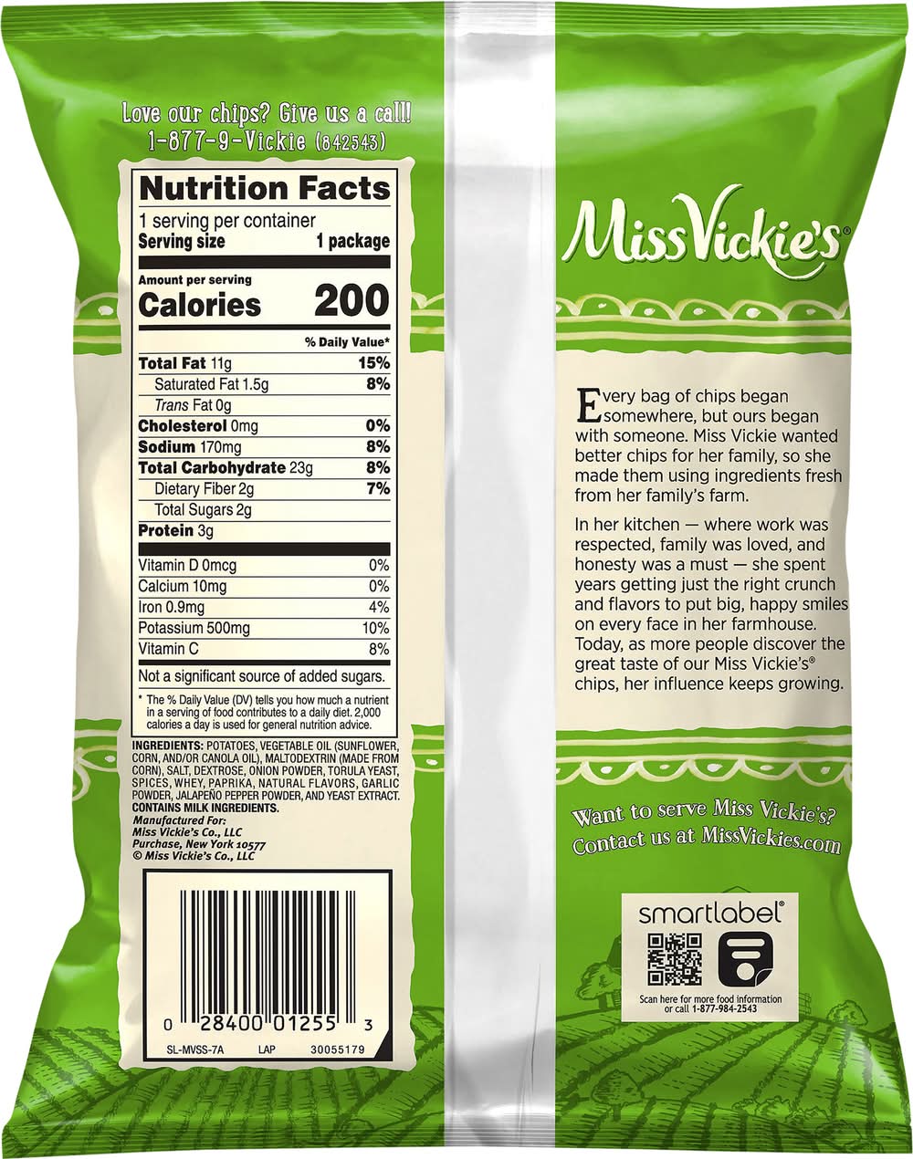Miss Vickie started making her kettle-cooked potato chips on her family's farm. To this day, each batch is still made with the same care. And once you've tasted Miss Vickie's Kettle Cooked Potato Chips, we think you'll appreciate every crunchy bite! • Flavor: Jalapeno • Number of servings: 1 • Miss Vickie's Co., LLC., Purchase, NY, 10577
