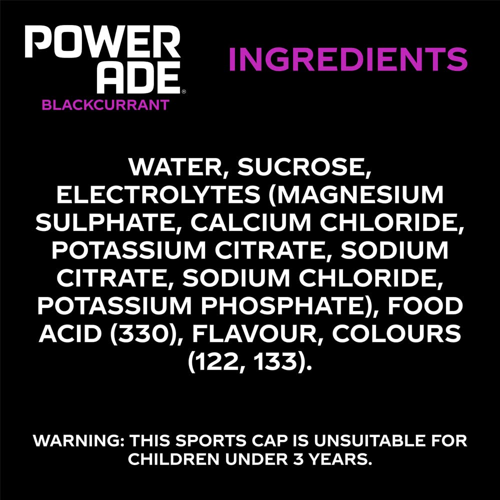 Powerade ION4 Blackcurrant isotonic sports drinks contain four electrolytes Sodium, Potassium, Calcium and Magnesium formulated to hydrate you fast when you need it most by replacing electrolytes and fluids lost in sweat. Flavor: Blackcurrent
