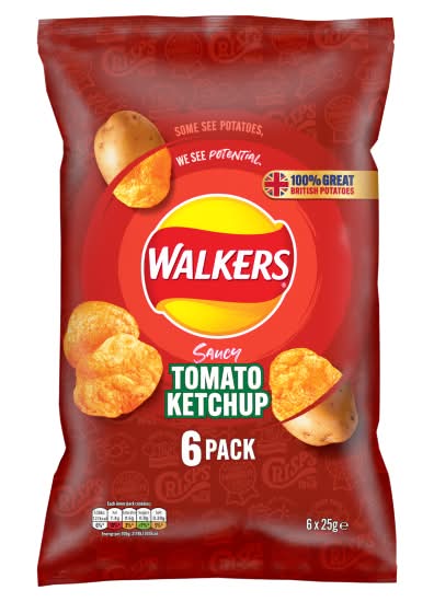- Multipack of Walkers Tomato Ketchup crisps - Made with 100% Great British Potatoes - Fresh taste guaranteed - Perfect crisps for lunch and snacking - Multipack contains 6 bags of crisps - Suitable for vegetarians - No added MSG, Artificial Colours • Walkers Snack Foods Ltd, PO Box 23, Leicester, LE4 8ZU • Packaging: Reusable