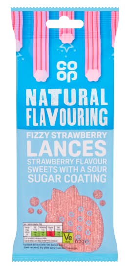 Co-Op Strawberry Fizzy Lances come with a sour sugar coating and natural flavouring. Each pack contains 65g of product. • Flavor: Strawberry • Co-op (Gb), M60 0AG. • Packaging: Reusable
