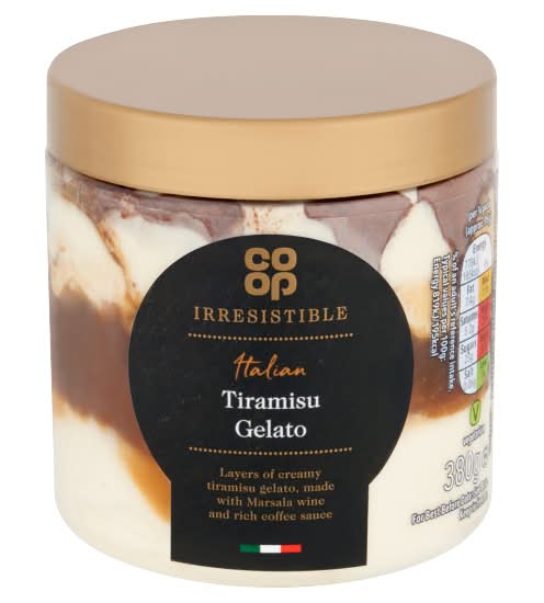 This mascarpone gelato with Marsala wine layered with coffee sauce and topped with cocoa. Layers of creamy tiramisu gelato, made with marsala wine and rich coffee sauce • Flavor: Tiramisu • Co-op (GB), Manchester, M60 0AG. • Packaging: Reusable