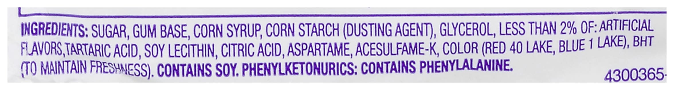 Ingredients: Sugar, Gum Base, Corn Syrup, Corn Starch (Dusting Agent), Glycerol, Less than 2% of: Artificial Flavors, Tartaric Acid, Soy Lecithin, Citric Acid, Aspartame, Acesulfame-K, Color (Red 40 Lake, Blue I Lake), BHT (to Maintain Freshness) Contains: Soybeans