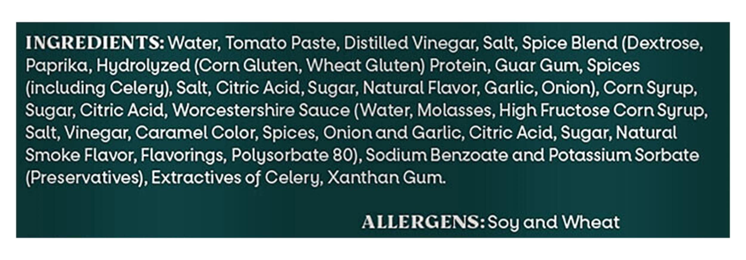 Ingredients: Water, Tomato Paste, Distilled Vinegar, Salt, Spice Blend (Dextrose, Paprika, Hydrolyzed (Corn Gluten, Wheat Gluten) Protein, Guar Gum, Spices (Including Celery), Salt, Citric Acid, Sugar, Natural Flavor, Garlic, Onion), Corn Syrup, Sugar, Citric Acid, Worcestershire Sauce (Water, Molasses, High Fructose Corn Syrup, Salt, Vinegar, Caramel Color, Spices, Onion and Garlic, Citric Acid, Sugar, Natural Smoke Flavor, Flavorings, Polysorbate 80), Sodium Benzoate and Potassium Sorbate (Preservatives), Extractives of Celery, Xanthan Gum Contains: Gluten, Wheat, Soybeans, Celery