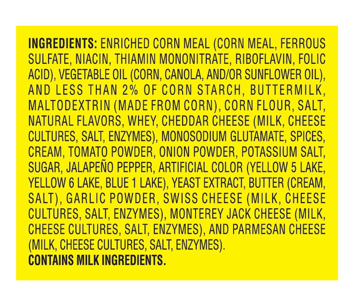 Ingredients: Enriched Corn Meal (Corn Meal, Ferrous Sulfate, Niacin, Thiamin Mononitrate, Riboflavin, Folic Acid), Vegetable Oil (Corn, Canola, and/or Sunflower Oil), and Less than 2% of Corn Starch, Buttermilk, Maltodextrin (Made from Corn), Corn Flour, Salt, Natural Flavors, Whey, Cheddar Cheese (Milk, Cheese Cultures, Salt, Enzymes), Monosodium Glutamate, Spices, Cream, Tomato Powder, Onion Powder, Potassium Salt, Sugar, Jalapeño Pepper, Artificial Color (Yellow 5 Lake, Yellow 6 Lake, Blue 1 Lake), Yeast Extract, Butter (Cream, Salt), Garlic Powder, Swiss Cheese (Milk, Cheese Cultures, Salt, Enzymes), Monterey Jack Cheese (Milk, Cheese Cultures, Salt, Enzymes), and Parmesan Cheese (Milk, Cheese Cultures, Salt, Enzymes) Contains: Milk