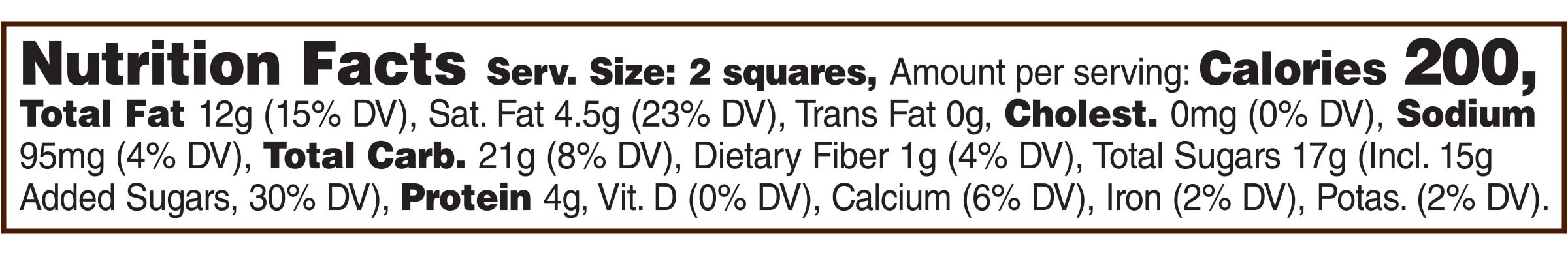 Ingredients: Peanuts, Sugar, Invert Sugar, Vegetable Oil (Palm Oil, Hydrogenated Palm Kernel Oil and Hydrogenated Cottonseed Oil), Corn Syrup, Cocoa Butter, Lactose, Skim Milk, Chocolate, Corn Syrup, Corn Syrup Solids, Dextrose, Less than 2% - Peanut Flour, Vegetable Glycerine, Milkfat, Salt, Calcium Carbonate, Soy Lecithin, TBHQ to Maintain Freshness. Contains: Contains peanuts, milk and soy. May contain tree nuts and egg.