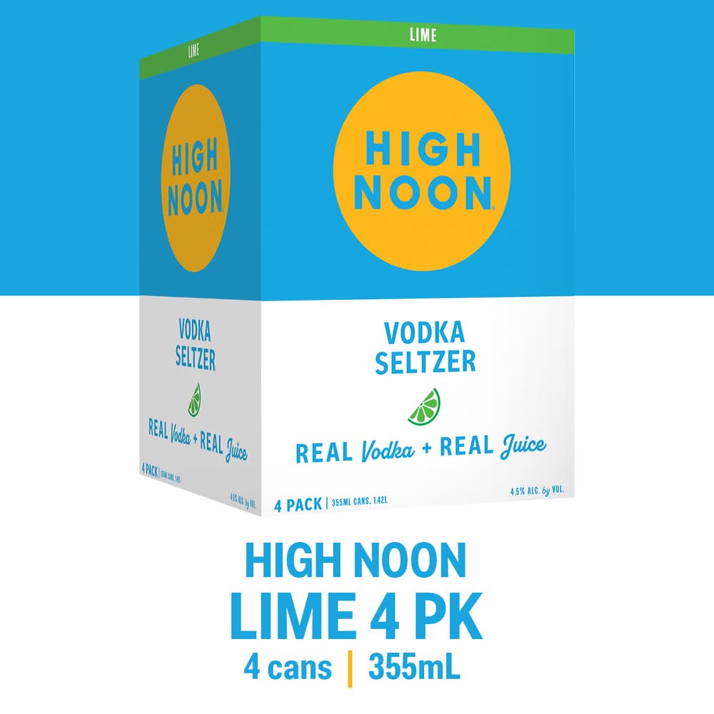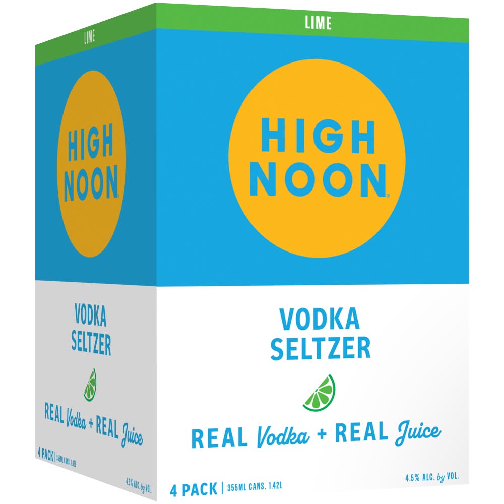 Vodka with real fruit juice, sparkling water & natural flavors. 100 calories. What's Inside - Average Analysis per 12 fl. oz.: 100 Calories; 0 g total fat; 2.3 g total carbohydrate; 2.3 g sugars; 0 g protein. Gluten free. No added sugar. Real vodka + real juice. Made with real vodka, real fruit juice, and sparkling water. The easy-drinking, always socializing, great tasting, sun-toasting, blue sky celebrating, memory-making - awesomeness in a can - hard seltzer. Get out and enjoy! www.highnoonspirits.com. Try our other flavors: Grapefruit, Black cherry, Watermelon, Peach, Pineapple. 4.5% alc. by vol. 9 • Flavor: Lime • Pack size: 4 • Alcohol by volume: 4.5% • High Noon Spirits Company, Modesto,CA