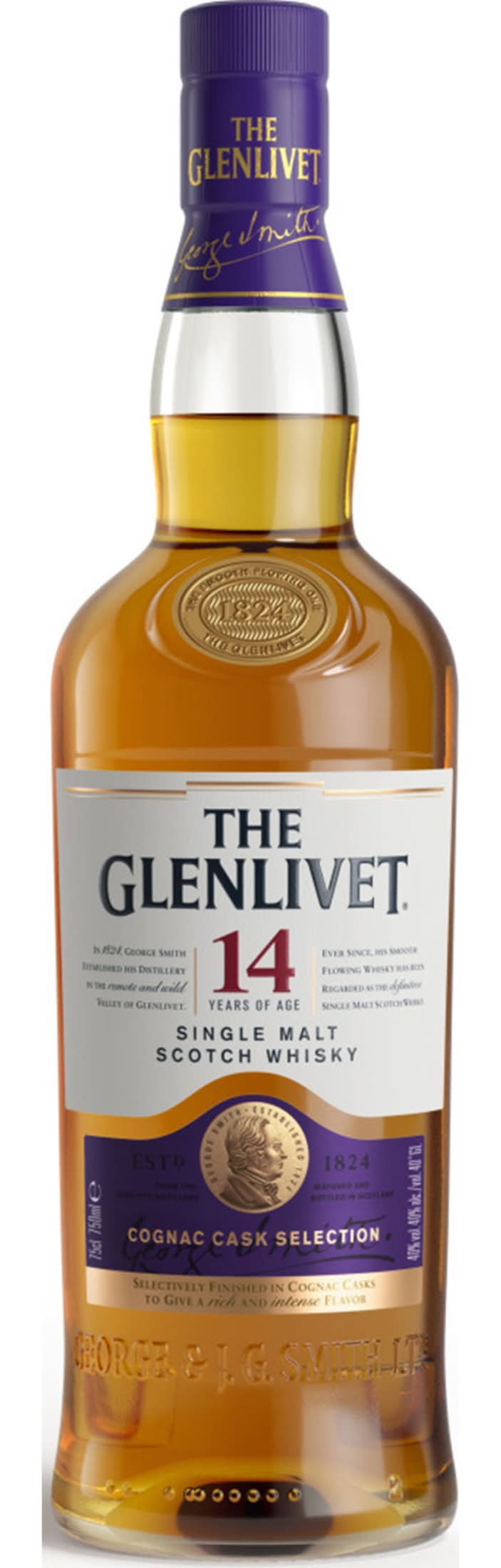 Inspired by Captain Bill Smith Grant, great-grandson of The Glenlivet's Founder George Smith, The Glenlivet 14 Year Old shines as a proud celebration of the Speyside craft. This luscious liquid is matured in bourbon and sherry casks before being finished in the highest quality ex-Cognac casks. • Alcohol by volume: 40% • The Glenlivet Distilling Company, New York,NY