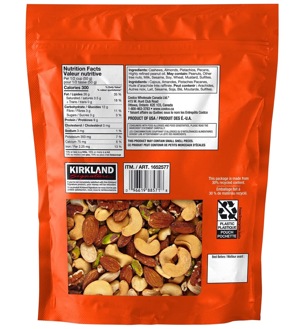Kirkland Signature Unsalted Mixed Nuts, 1.13 Kg