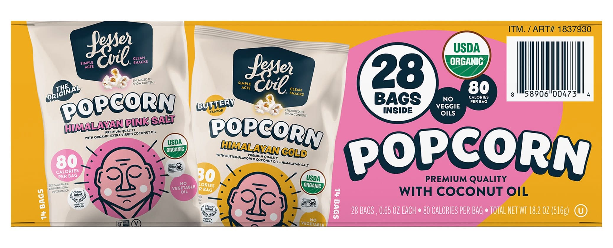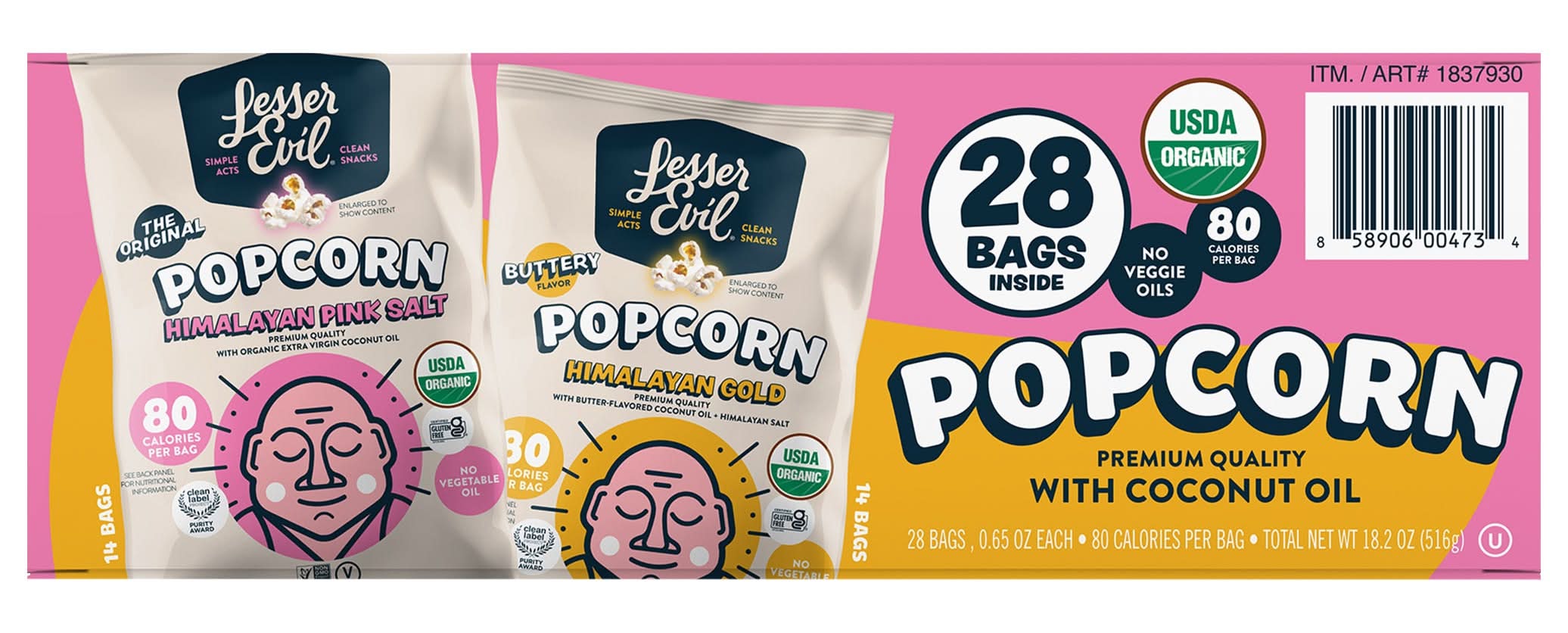LesserEvil Organic Popcorn With Coconut Oil Variety pack, Himalayan Pink Salt- Himalayan Gold (28 x 0.65 oz)