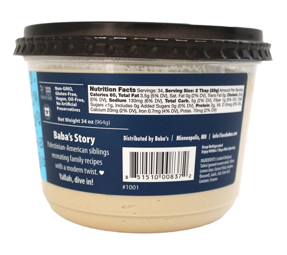 Jerusalem-style; Made with copious amounts of tahini for extra velvety, smooth texture; No artificial preservatives; Non-GMO Certified; Vegan; Gluten-free; Oil-free; Halal.