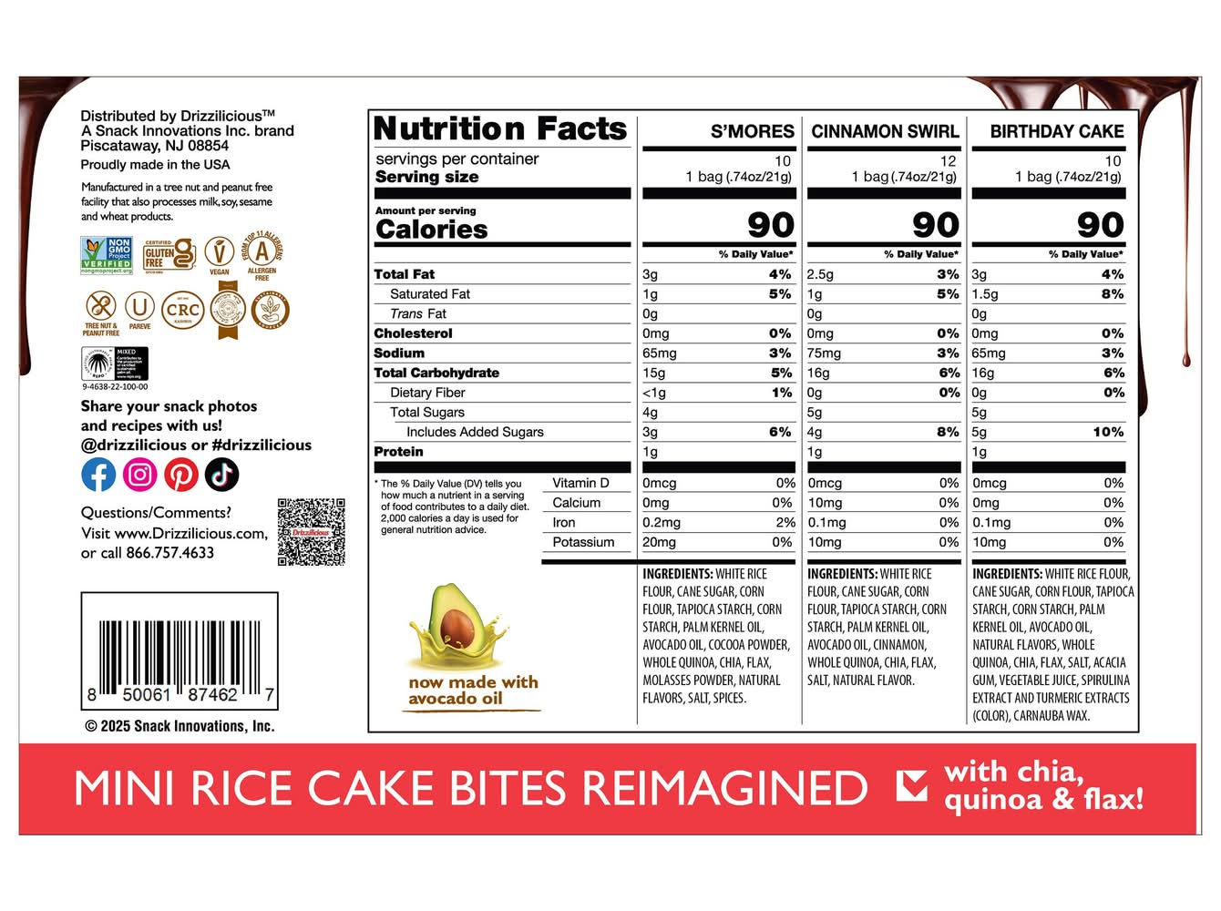 Mini Rice Cake Bites Reimagined with Chia, Quinoa, & Flax. Made with Avocado Oil. Non GMO Verified; Vegan & Kosher; Gluten, Tree Nut, & Peanut Free; Allergen Free From Top 11 Allergens • Flavor: Assorted • Pack size: 32