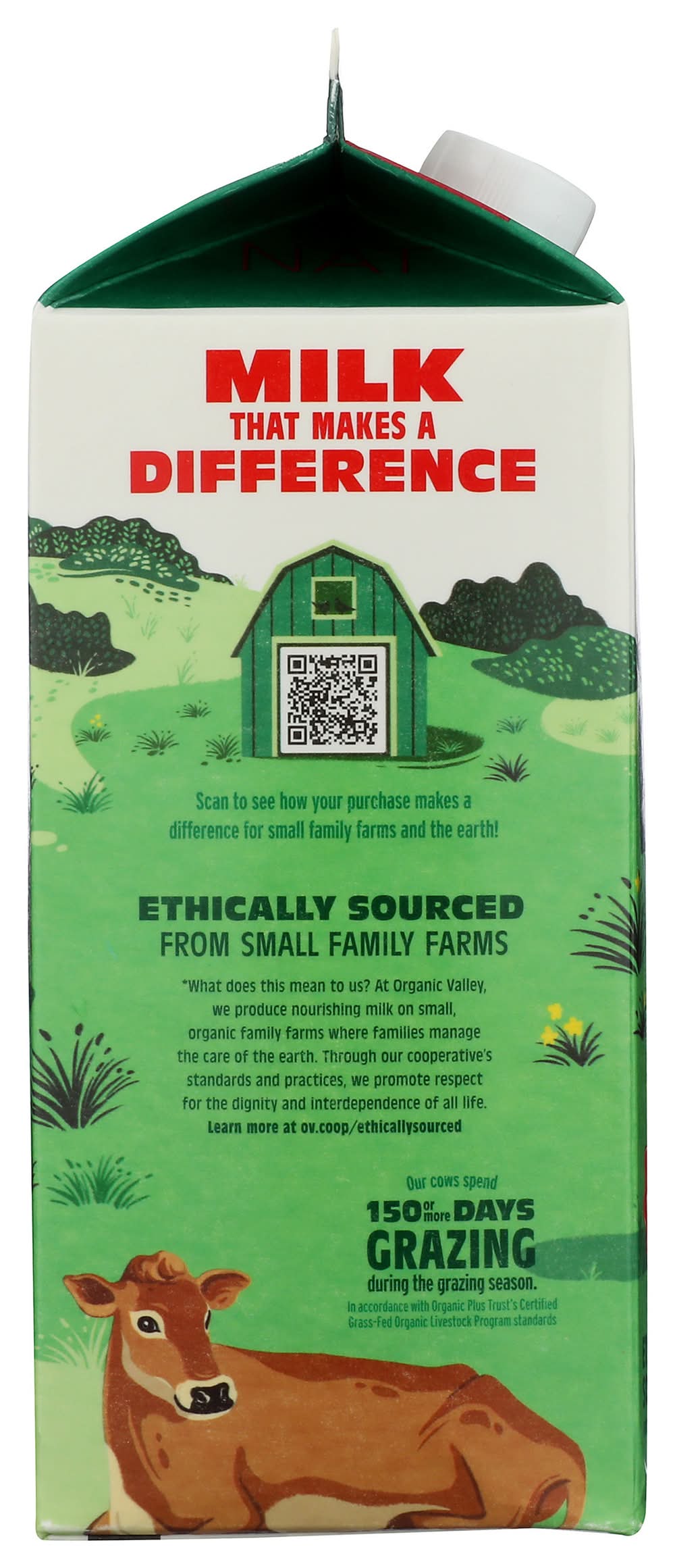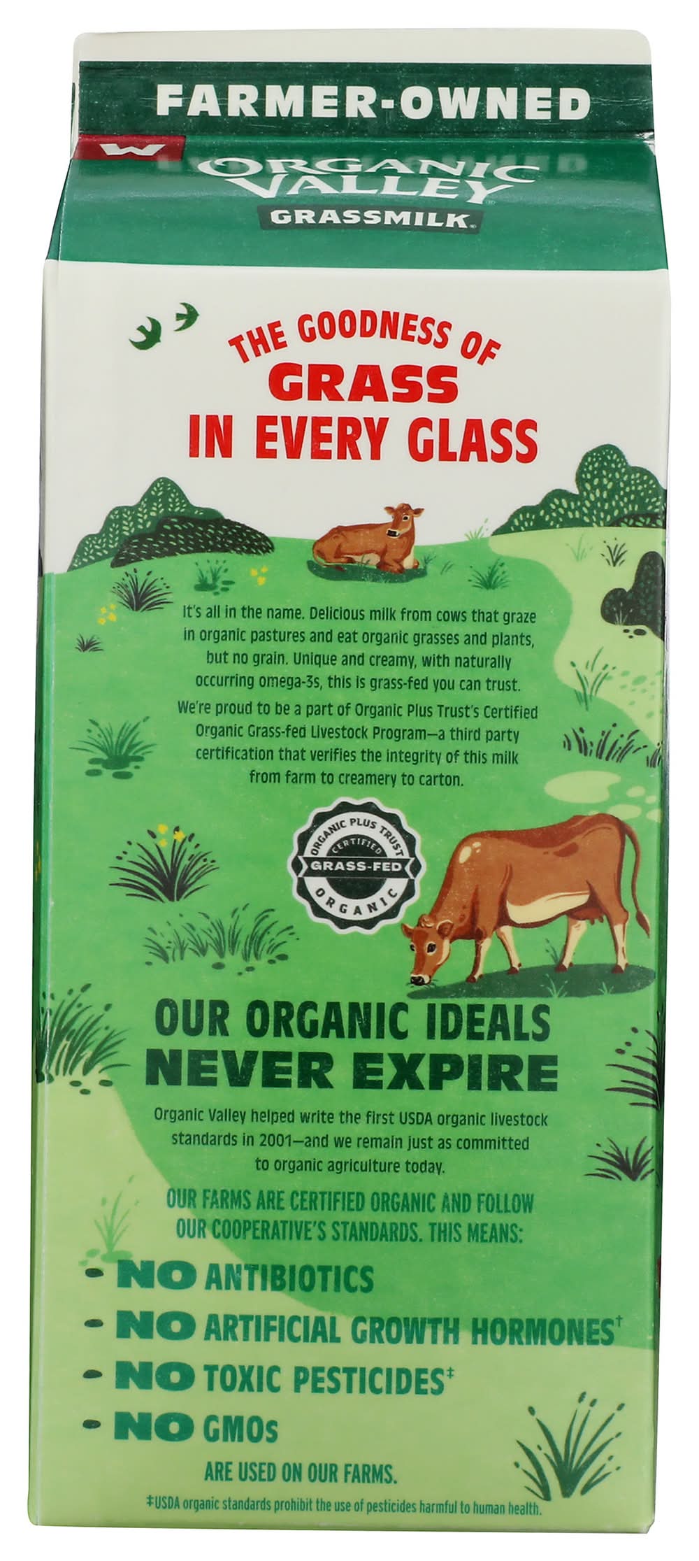 Organic valley grass milk whole milk is ultra-pasteurized milk sourced from 100% certified grass-fed farms. It is fda organic and certified organic by oregon tilth, including the opt grass-fed organic certification. The milk is halal certified and contains naturally occurring omega-3, with an average of 100 mg omega-3 and 90 mg cla per serving, and is fortified with vitamin d. It is produced without the use of gmos, antibiotics, synthetic hormones, or toxic pesticides. The milk comes from cows that exclusively graze on organic pastures, feeding on grasses and plants without a grain diet. It is sourced ethically from small family farms that adhere to cooperative standards for animal care and sustainable farming practices. The product is part of the organic plus trust's certified organic grass-fed livestock program, ensuring verification from farm to creamery to carton. • Size: OZ 64 • Packaging: Reusable