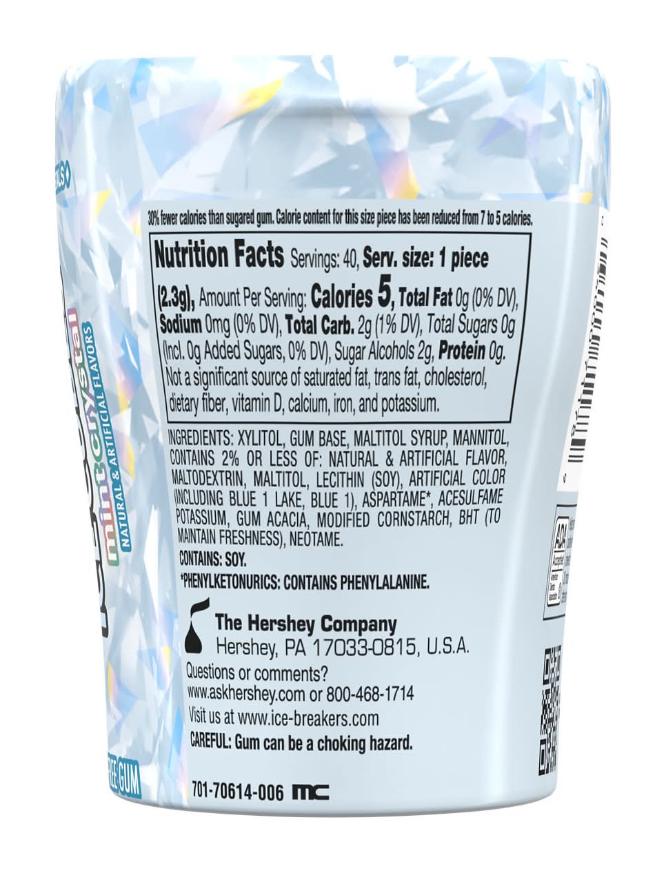 Invite a burst of freshness with ICE BREAKERS ICE CUBES mint crystal flavored sugar free chewing gum. Featured in a convenient 40-piece bottle, this minty flavored chewing gum offers a sugar free burst of invigorating flavor by your side anywhere you go. Take this convenient cube bottle anywhere you need a boost of freshness. This mint chewing gum is a quick and delicious satisfaction, that'll be your best friend during important moments in your life. Wherever the day takes you, these ADA accepted ICE BREAKERS ICE CUBES chewing gum pieces are made with xylitol and keeps your taste buds busy during meetings, after lunch, throughout movie nights and in the car. Feeling generous? With this 40-piece gum cube, it's easy to share this treat amongst friends, family and co-workers. Getting ready for a first date? Pop a chewing gum piece before the first hello! Need to wake up during long road trips? Get a burst of energy after the first chew. Display this vibrant cube near the candy dish at home or work to let guests, family members, friends and co-workers help themselves. They're sure to thank you for the long lasting chewing gum treat. After all, it's just as good as a delectable minty dessert without any of the fuss.