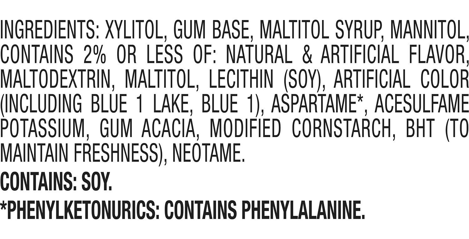 Ingredients: XYLITOL, GUM BASE, MALTITOL SYRUP, MANNITOL, CONTAINS 2% OR LESS OF: NATURAL ARTIFICIAL FLAVOR, MALTODEXTRIN, MALTITOL, LECITHIN (SOY), ARTIFICIAL COLOR (INCLUDING BLUE 1 LAKE, BLUE 1), ASPARTAME*, ACESULFAME POTASSIUM, GUM ACACIA, MODIFIED CORNSTARCH, BHT (TO MAINTAIN FRESHNESS), NEOTAME. Contains: Contains: Soy