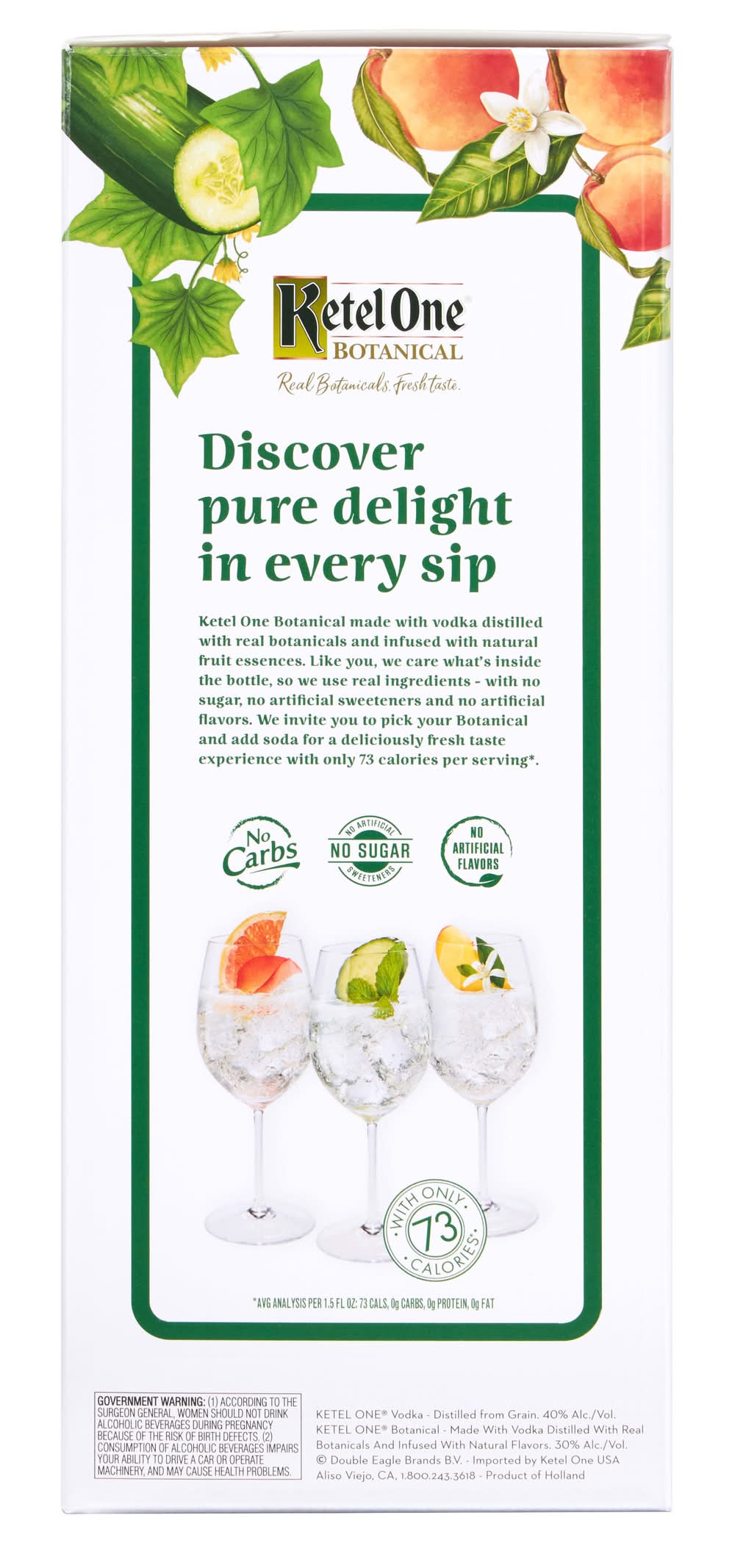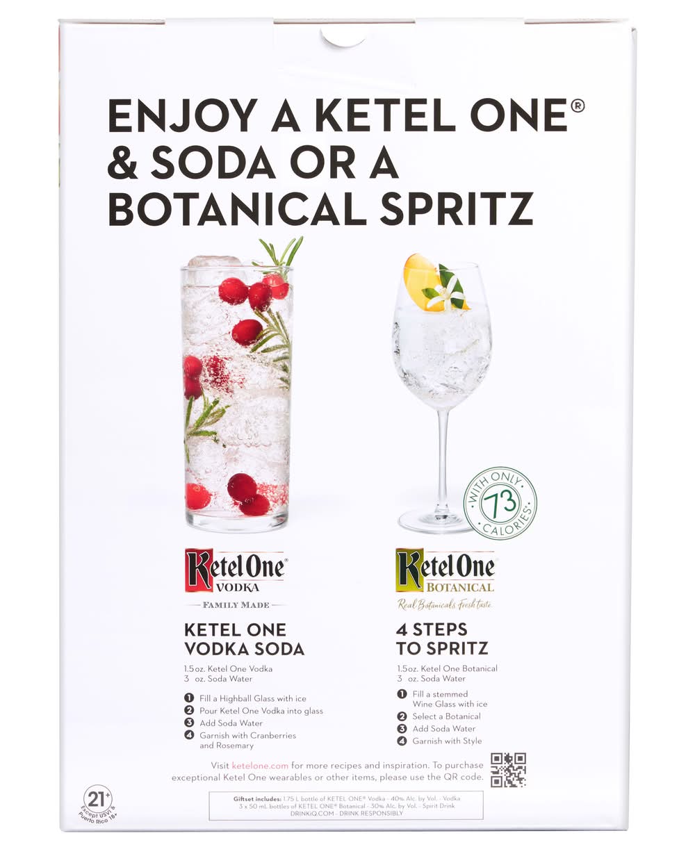 Explore all the flavors that Ketel One has to offer with Ketel One Vodka and a set of three mini bottles of Ketel One Botanicals Vodka Distilled with Real Botanicals and Infused with Natural Flavors. Our 80 proof vodka is carefully crafted using non-GMO grain. Combining modern column distillation with the unique liquid produced by copper pot stills, our vodka has a smooth, crisp taste. Discover an array of vibrant botanical flavors with Ketel One Botanicals Vodka Distilled with Real Botanicals and Infused with Natural Flavors Grapefruit & Rose, Peach & Orange Blossom, and Cucumber & Mint. For a Ketel One Bloody Mary, simply combine Ketel One Vodka with tomato juice, lemon juice, horseradish, Worcestershire sauce, and salt and pepper. Alcohol by volume: 40%