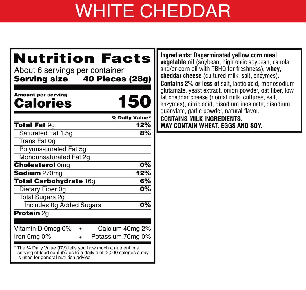 Ingredients: Degerminated Yellow Corn Meal, Vegetable Oil (Soybean, High Oleic Soybean, Canola And/Or Corn Oil With Tbhq For Freshness), Whey, Cheddar Cheese (Cultured Milk, Salt, Enzymes), . Contains 2% Or Less Of Salt, Lactic Acid, Monosodium Glutamate, Yeast Extract, Onion Powder, Oat Fiber, Low Fat Cheddar Cheese (Nonfat Milk, Cultures, Salt, Enzymes), Citric Acid, Disodium Inosinate, Disodium Guanylate, Garlic Powder, Natural Flavor. Contains: Contains milk ingredients. may contain wheat, eggs and soy.
