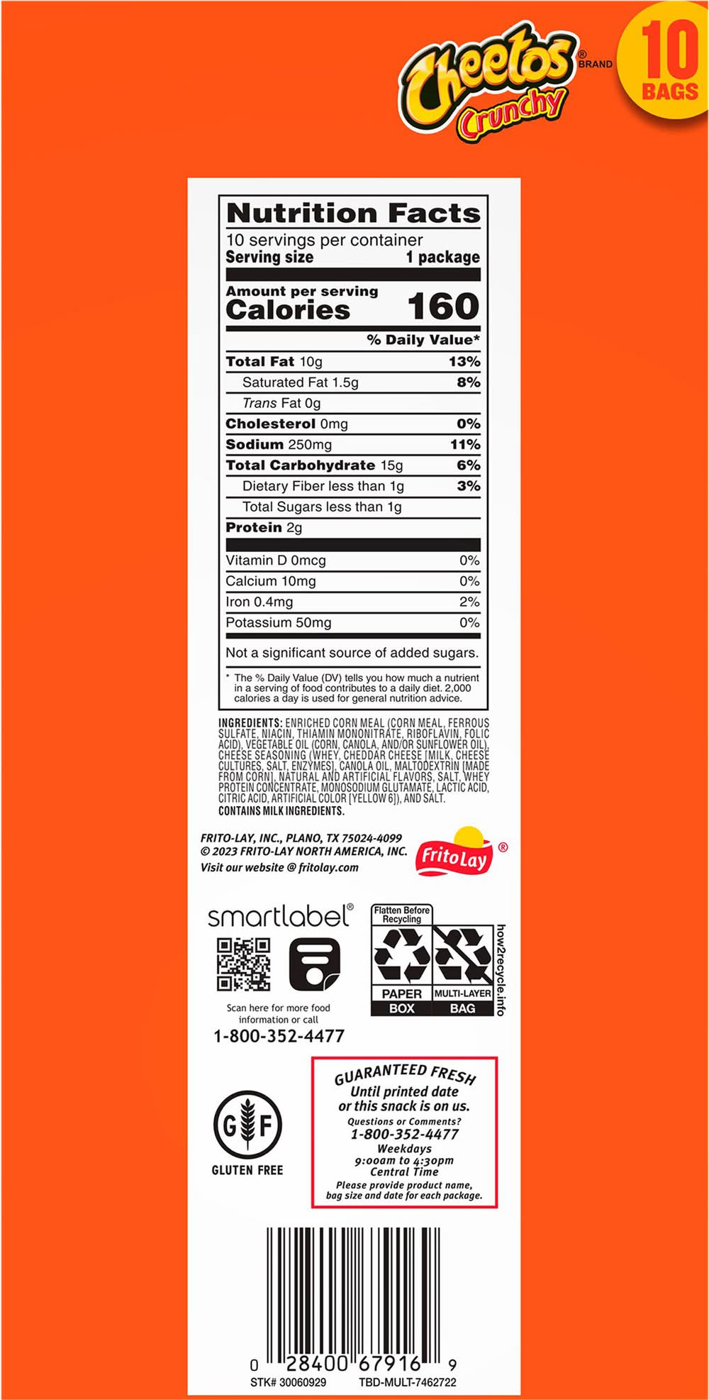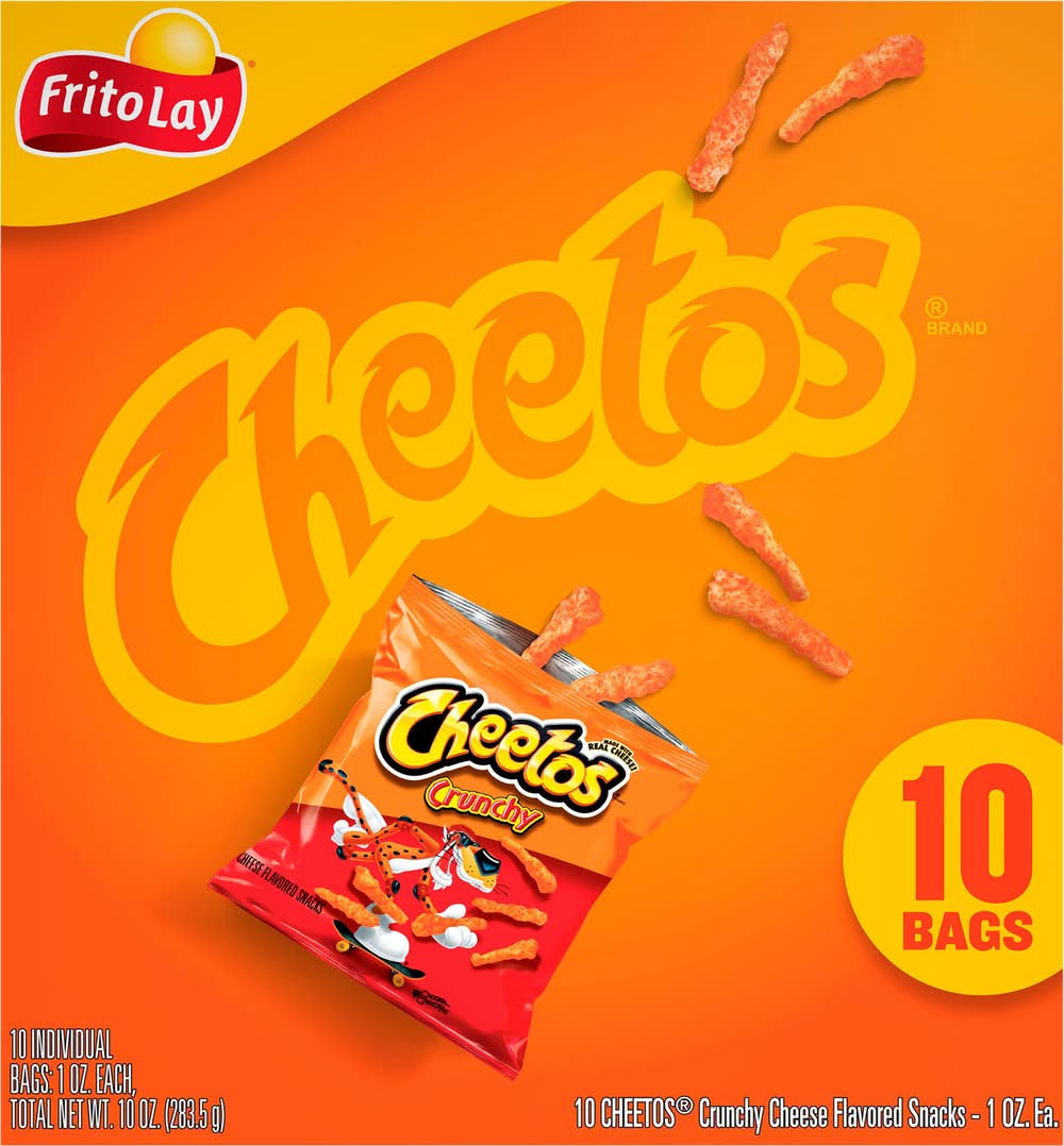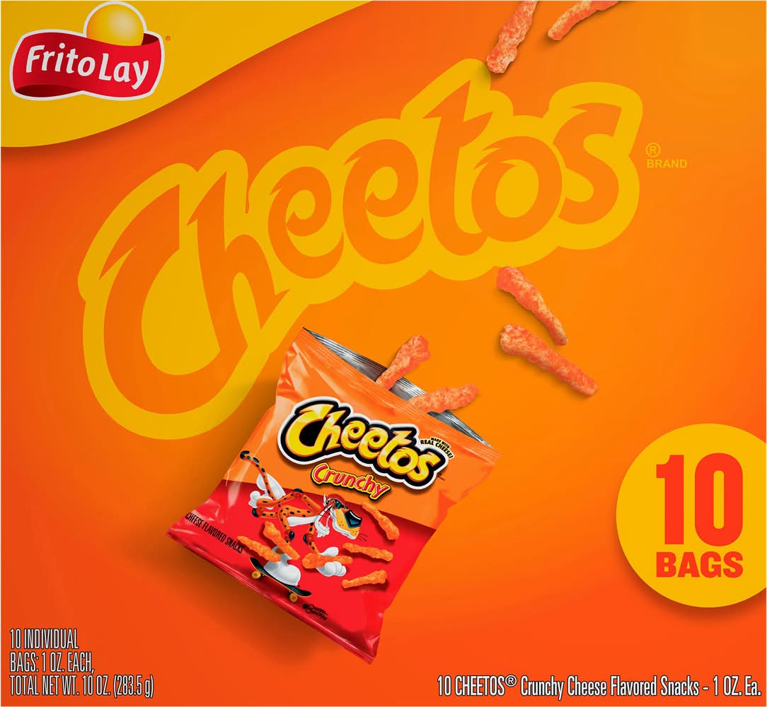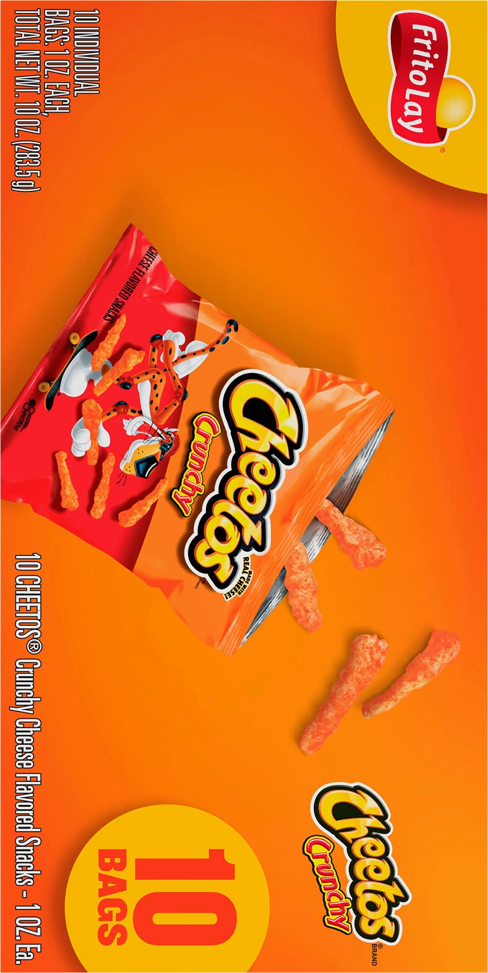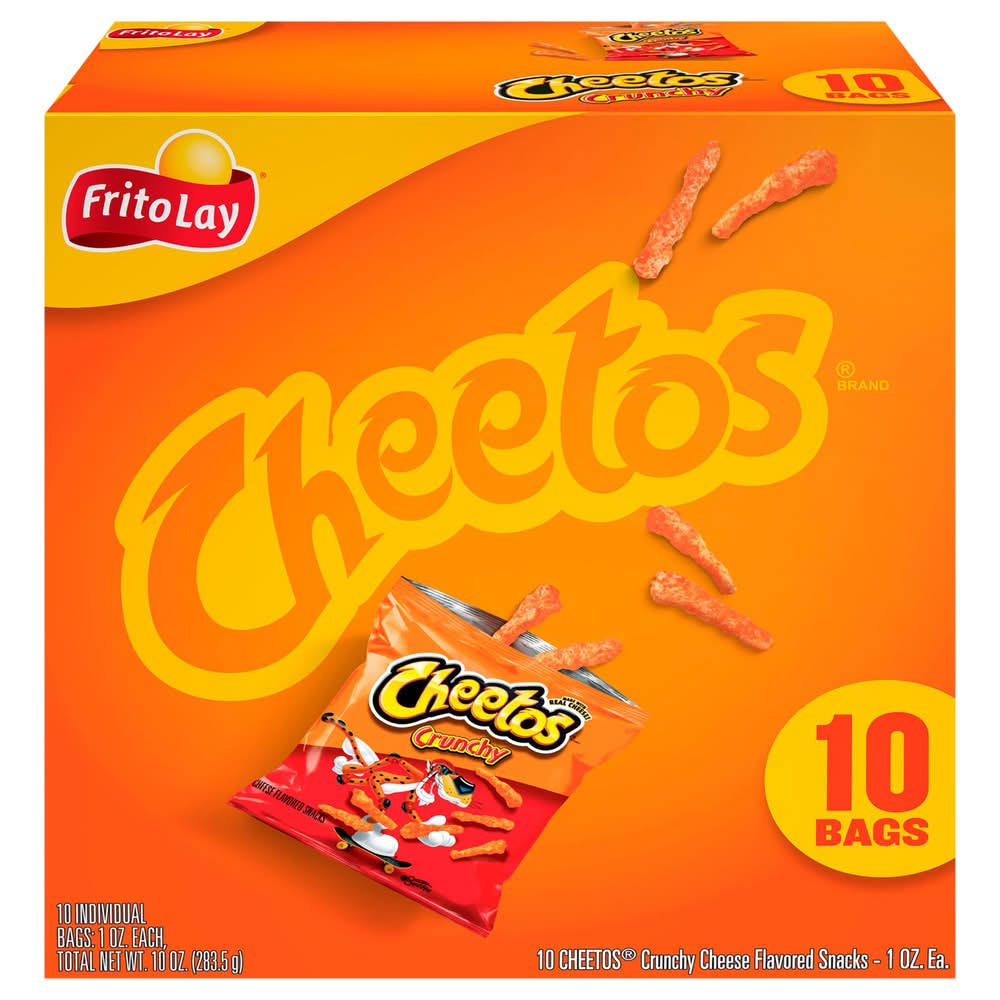 Cheetos snacks are the much-loved cheesy treats that are fun for everyone! You just can't eat a Cheetos snack without licking the "cheetle" off your fingertips. • Flavor: Cheese • Pack size: 10 • Frito-Lay, Inc., Plano,TX,75024-4099 • Packaging: Reusable