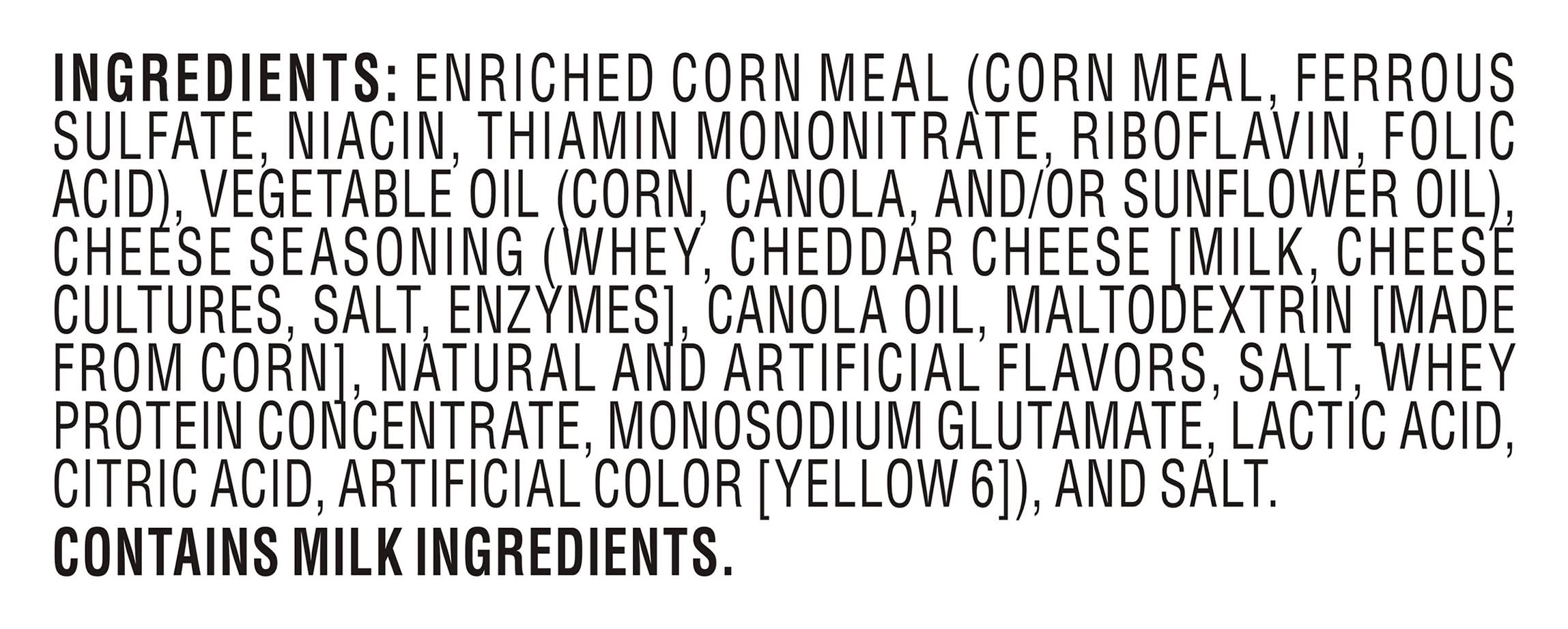 Ingredients: Enriched Corn Meal (Corn Meal, Ferrous Sulfate, Niacin, Thiamin Mononitrate, Riboflavin, Folic Acid), Vegetable Oil (Corn, Canola, And/Or Sunflower Oil), Cheese Seasoning (Whey, Cheddar Cheese [Milk, Cheese Cultures, Salt, Enzymes], Canola Oil, Maltodextrin [Made From Corn], Natural And Artificial Flavors, Salt, Whey Protein Concentrate, Monosodium Glutamate, Lactic Acid, Citric Acid, Artificial Color [Yellow 6]) Contains: Milk, Corn