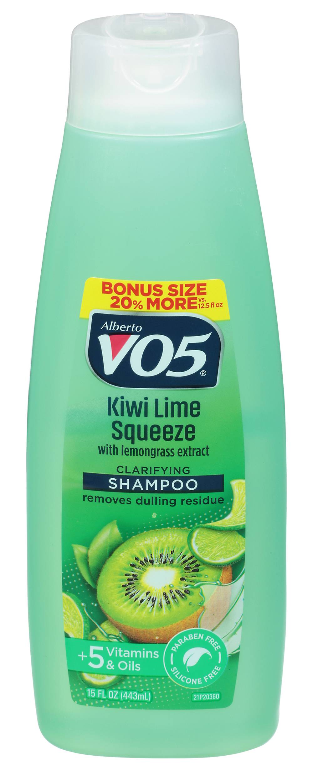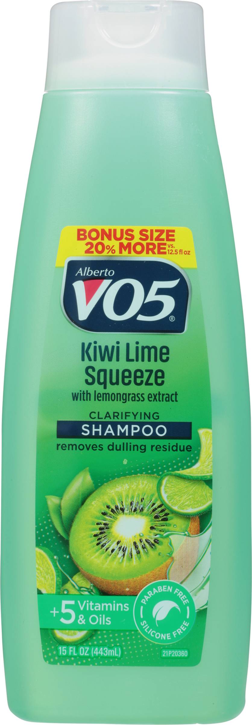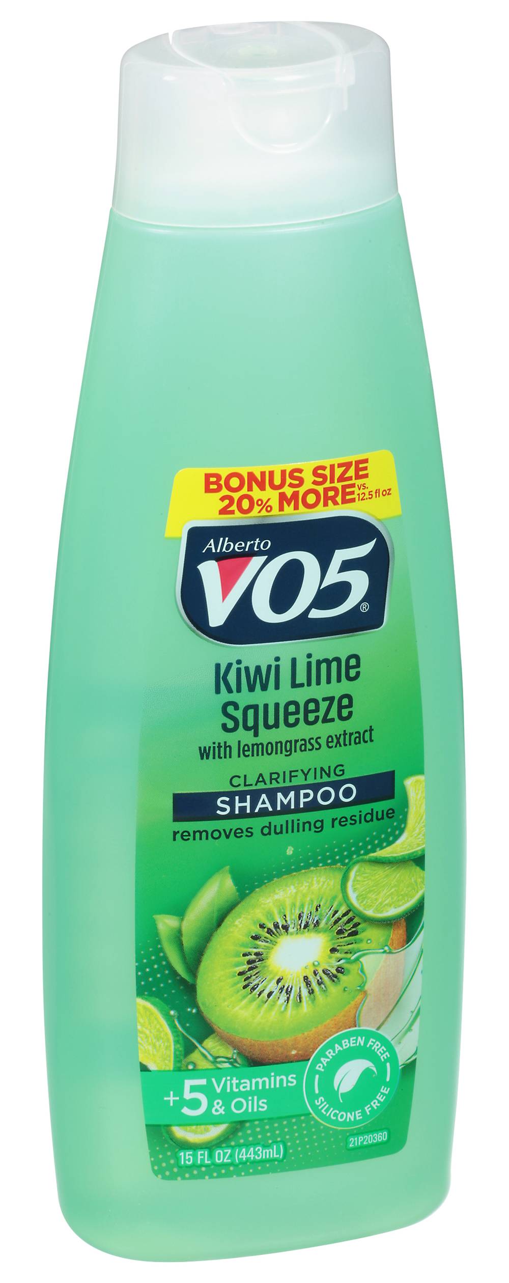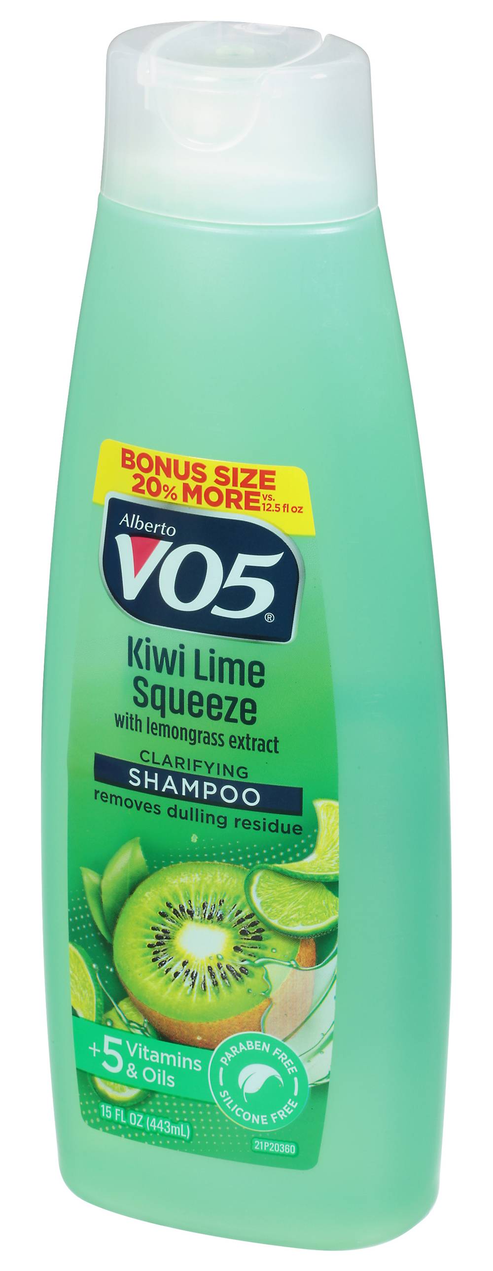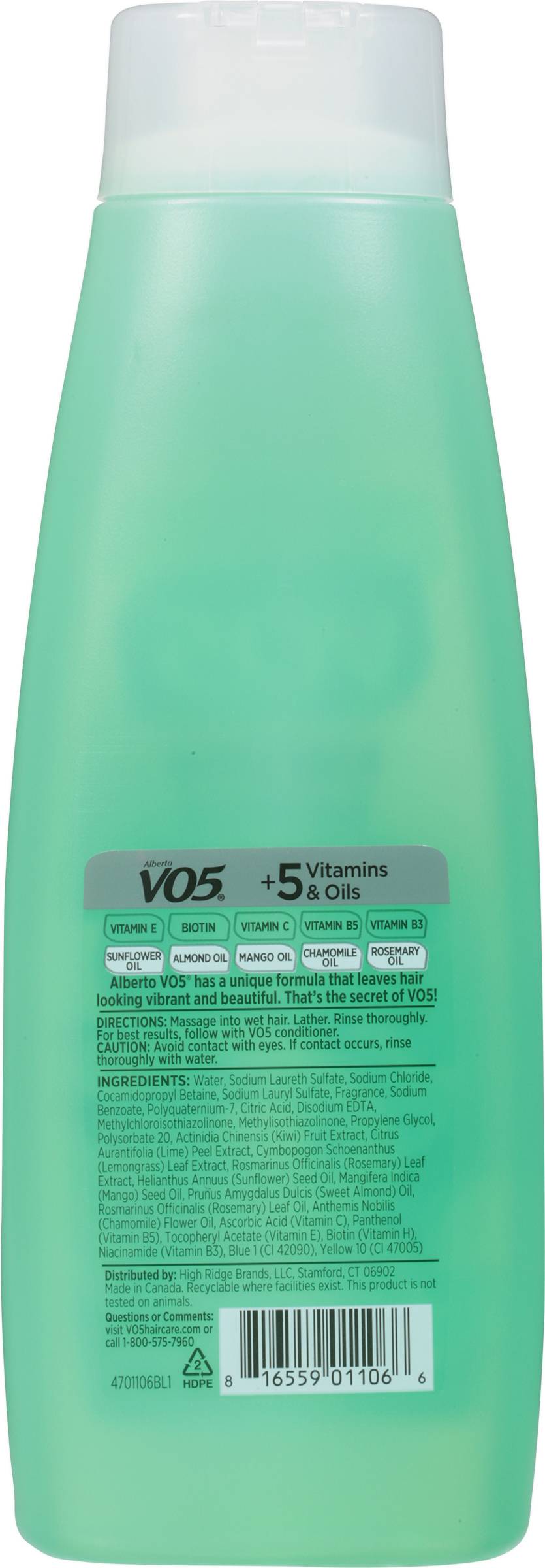Kiwi lime squeeze with lemongrass extract. Bonus size 20% more vs 12.5 fl oz. Removes dulling residue. +5 vitamins & oils. Paraben free. Silicone free. Vitamin E. Biotin. Vitamin C. Vitamin B5. Vitamin B3. Sunflower oil. Almond oil. Mango oil. Chamomile oil. Rosemary oil. Alberto VO5 has a unique formula that leaves hair looking vibrant and beautiful. That's the secret of VO5! VO5Haircare.com. Questions or Comments? Visit V05haircare.com or call 800-575-7960 This product is not tested on animals. Made in Canada.