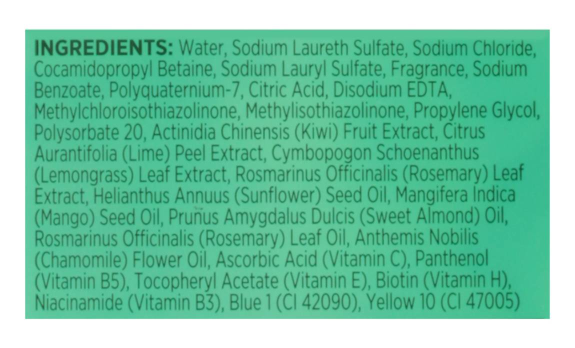 Ingredients: Water, Sodium Laureth Sulfate, Sodium Chloride Cocamidopropyl Betaine, Sodium Lauryl Sulfate, Fragrance, Sodium Benzoate, Polyquaternium-7, Citric Acid, Disodium EDTA, Methylchloroisothiazolinone, Methylisothiazolinone, Propylene Glycol, Polysorbate 20, Actinidia Chinensis (Kiwi) Fruit Extract, Citrus Aurantifolia (Lime) Peel Extract, Cymbopogon Schoenanthus (Lemongrass) Leaf Extract, Rosmarinus Officinalis (Rosemary) Lear Extract, Helianthus Annuus (Sunflower) Seed Oi1, Mangifera Indica (Mango) Seed Oil, Prunus Amygdalus Dulcis (Sweet Almond) Oil, Rosmarinus Officinalis (Rosemary) Leaf Oil, Anthemis Nobilis (Chamomile) Flower Oil, Ascorbic Acid (Vitamin C), Panthenol (Vitamin B5), Tocopheryl Acetate (Vitamin E), Biotin (Vitamin H), Niacinamide (Vitamin B3), Blue 1 (CI 42090), Yellow 10 (CI 47005) Contains: Almonds