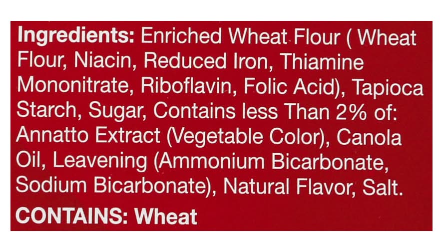 Ingredients: Enriched Wheat Flour (Wheat Flour, Niacin, Reduced Iron, Thiamine Mononitrate, Riboflavin, Folic Acid), Tapioca Starch, Sugar, Contains Less than 25 of: Annatto Extract (Vegetable Color), Canola Oil, Leavening (Ammonium Bicarbonate, Sodium Bicarbonate), Natural Flavor, Salt Contains: Wheat
