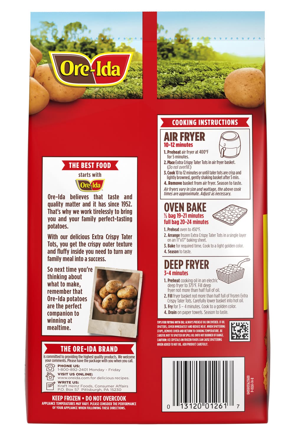 Directions for use: Bake: Oven Bake 1/2 Bag Instructions (serves about 5) Preheat oven to 450. Arrange frozen Extra Crispy Tater Tots in a single layer on an 11"x17" baking sheet. Heat for 1 21 minutes. Cook to a light golden color. Season to taste. Full Bag Instructions (serves ab Preheat oven to 450 Arrange frozen Extra Crispy Tater Tots in a single layer on an 11"x17" baking sheet. Heat for 24 minutes. Cook to a light golden color. Season to taste. Deep Fry: Deep Fryer Preheat cooking oil in electric deep fryer to 375F. Fill deep fryer not more than half full of oil. Fill fryer basket not more than half full of frozen Extra Crispy Tater Tots. Carefully lower basket into hot oil. 4 minutes. Cook to a light golden color. Drain on paper towels. Season to taste. Storage recommendation: Frozen