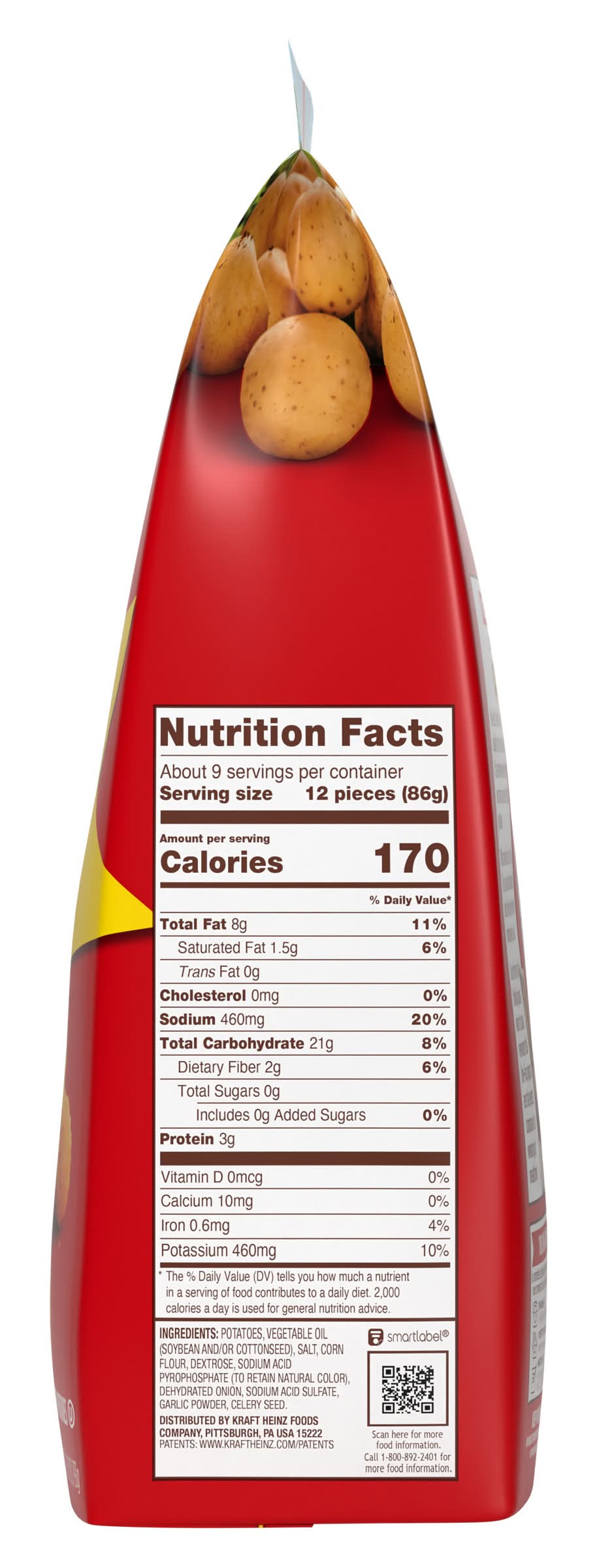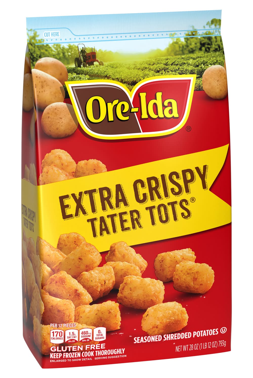 Ore-Ida Extra Crispy Tater Tots make it easy to enjoy delicious seasoned potatoes at home. Crispy and golden, these Grade A Tater Tots are made from freshly peeled, American grown potatoes. These gluten free Tater Tots offer an extra crispy outside with a fluffy inside for the perfect blend of textures to make your next family meal a success. Toss these frozen Tater Tots on a baking sheet to bake them in the oven according to package instructions for perfectly crispy tater tots every time. An American classic, these easy tots are made with shredded potatoes and are perfect for dipping. Serve with the traditional burger, or get creative with loaded tots topped with cheese and bacon. Your family deserves the highest quality because if it's not Grade A, it's not Ore-Ida! Kraft Heinz Foods Company, Pittsburgh, PA, 15222
