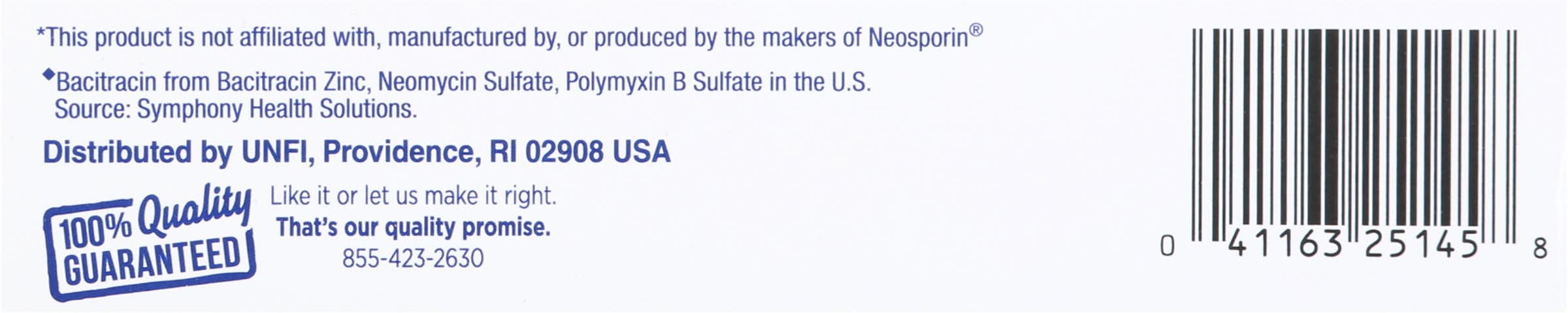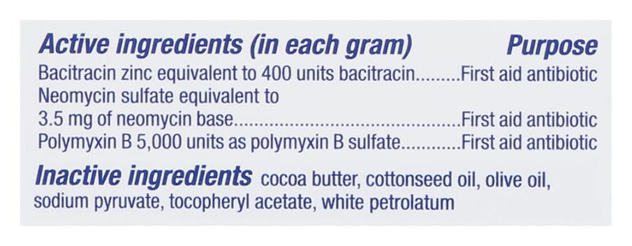 Ingredients: Active Ingredients: Bacitracin Zinc Equivalent to 400 Units Bacitracin, First aid antibiotic; Neomycin Sulfate Equivalent to 3.5 mg of Neomycin Base, First aid antibiotic; Polymyxin B 5, 000 Units as Polymyxin B Sulfate, First aid antibiotic. Inactive Ingredients: Cocoa Butter, Cottonseed Oil, Olive Oil, Sodium Pyruvate, Tocopheryl Acetate, White Petrolatum. Additives: Cocoa Butter, Cottonseed Oil, Olive Oil, Sodium Pyruvate, Tocopheryl Acetate, White Petrolatum.